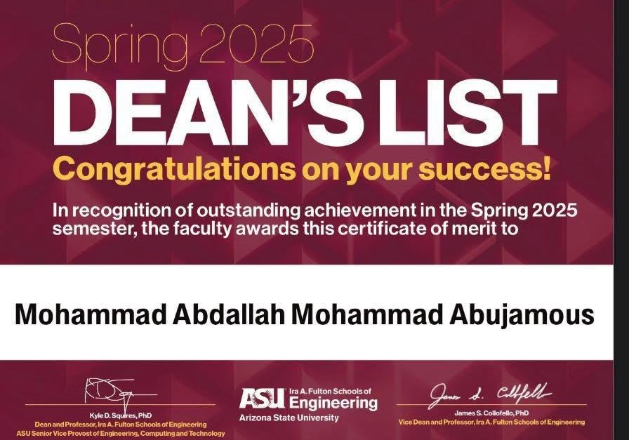 سجل الطالب الأردني محمد عبد الله أبو جاموس إنجازًا أكاديميًا لافتًا بحصوله على معدل 108 من 100 في تخصص الهندسة الكهربائية في جامعة أريزونا بولاية أريزونا الأمريكية، متجاوزًا المعدل الكامل بفضل أدائه الاستثنائي وتحقيقه لعلامات إضافية في مشاريعه البحثية وأنشطته الأكاديمية.