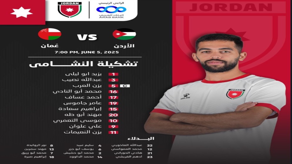 أعلن الاتحاد الأردني لكرة القدم، الخميس، تشكيلة المنتخب الوطني لملاقاة نظيره العماني ضمن منافسات الدور الحاسم من تصفيات كأس العالم 2026.