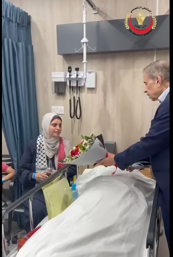 وقدم الدكتور فوز الحموري باقات من الورود للجرحى وذويهم ، وتبادل معهم الحديث متمنيا لهم الشفاء العاجل .