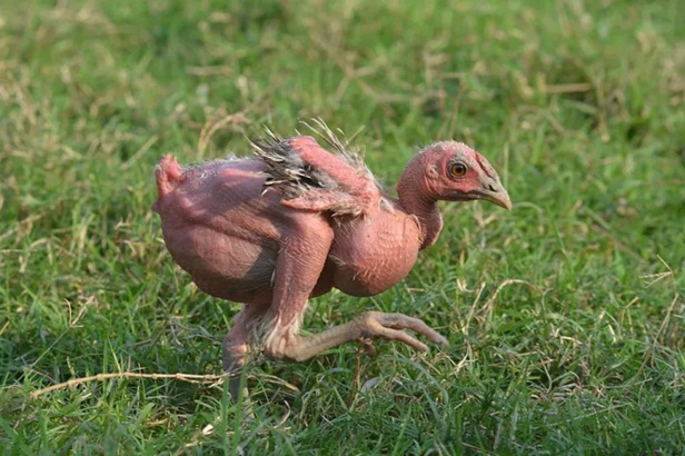 من الناحية العلمية، يبدو هذا النوع الجديد دجاجا عاديا، باستثناء أنه بلا ريش، وأمضى علماء الوراثة وقتا طويلا في تغيير تركيبة بنية الدجاجة دجاج التسمين عن طريق تهجينها مع طيور ذوات ريش أقل.