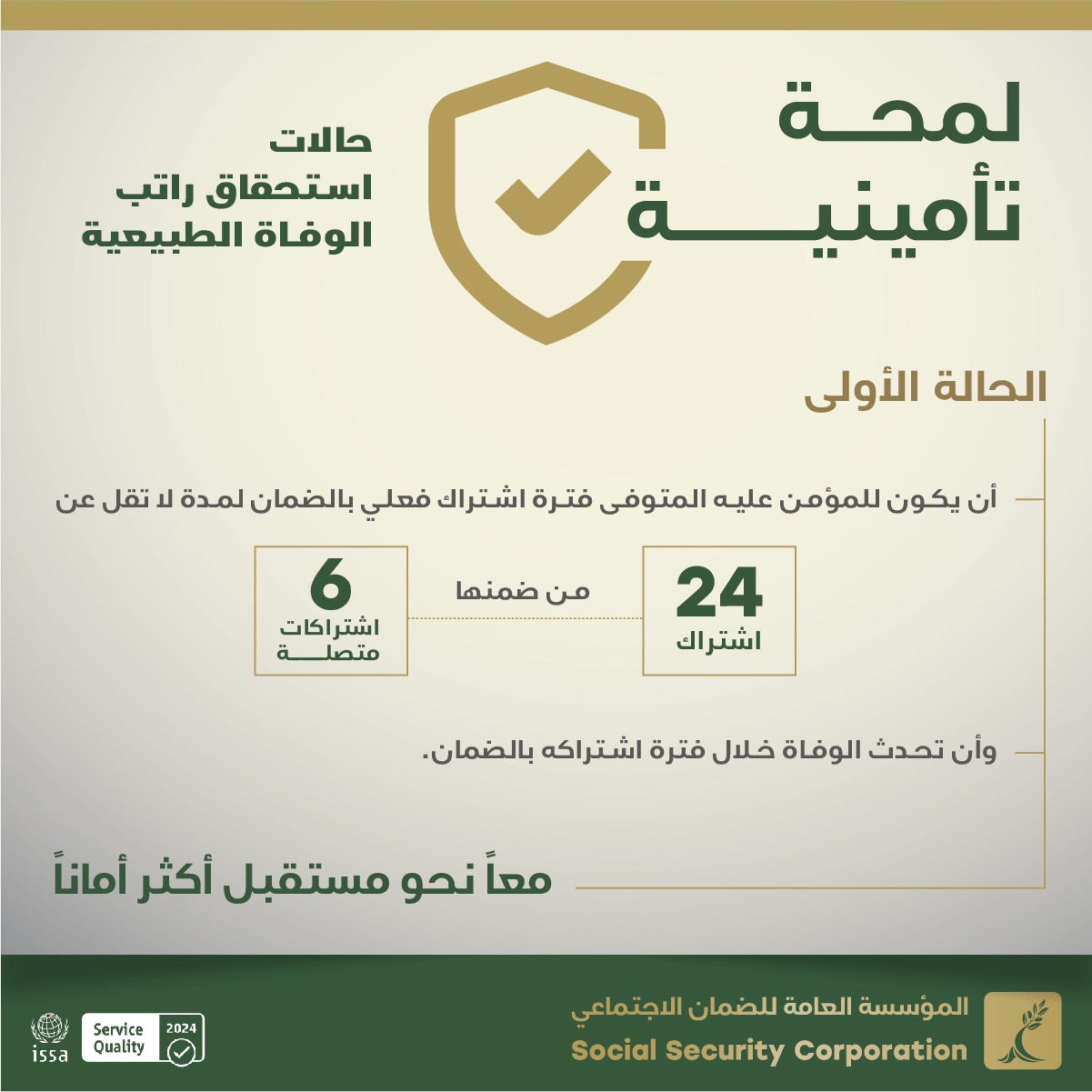 أوضحت المؤسسة العامة للضمان الاجتماعي أنه يُشترط لاستحقاق راتب تقاعد الوفاة الطبيعية أن يكون للمؤمن عليه المتوفى فترة اشتراك فعلي بالضمان لمدة لا تقل عن (24) اشتراكاً من ضمنها (6) اشتراكات متصلة، وأن تحدث الوفاة خلال فترة اشتراكه بالضمان.