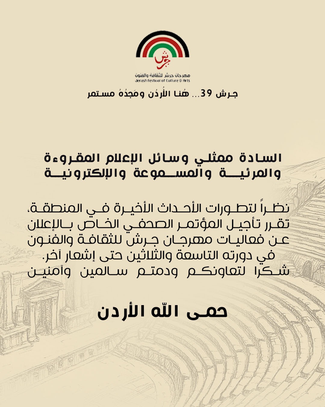 قررت إدارة مهرجان جرش بسبب تطورات الأحداث الأخيرة تأجيل المؤتمر الصحفي الخاص بالإعلان عن فعاليات المهرجان حتى إشعار آخر.