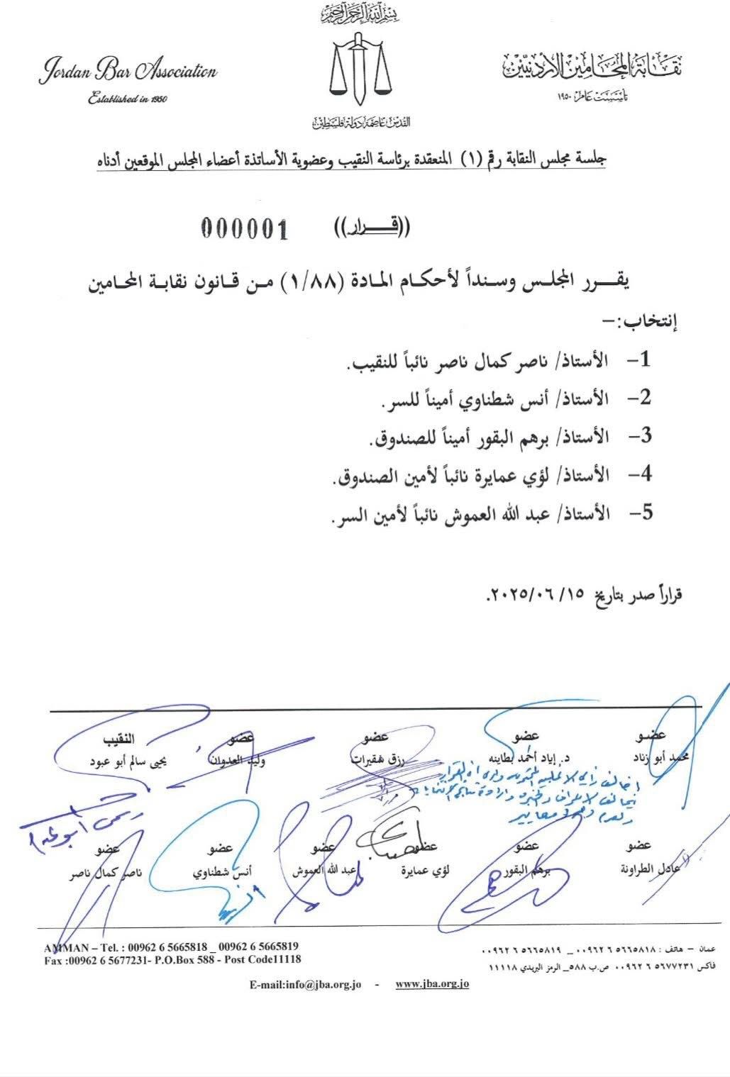 قرر مجلس نقابة المحامين في جلسته المنعقدة رقم (1) برئاسة النقيب يحيى أبو عبود، واستنادًا لأحكام المادة (88/1) من قانون نقابة المحامين انتخاب: