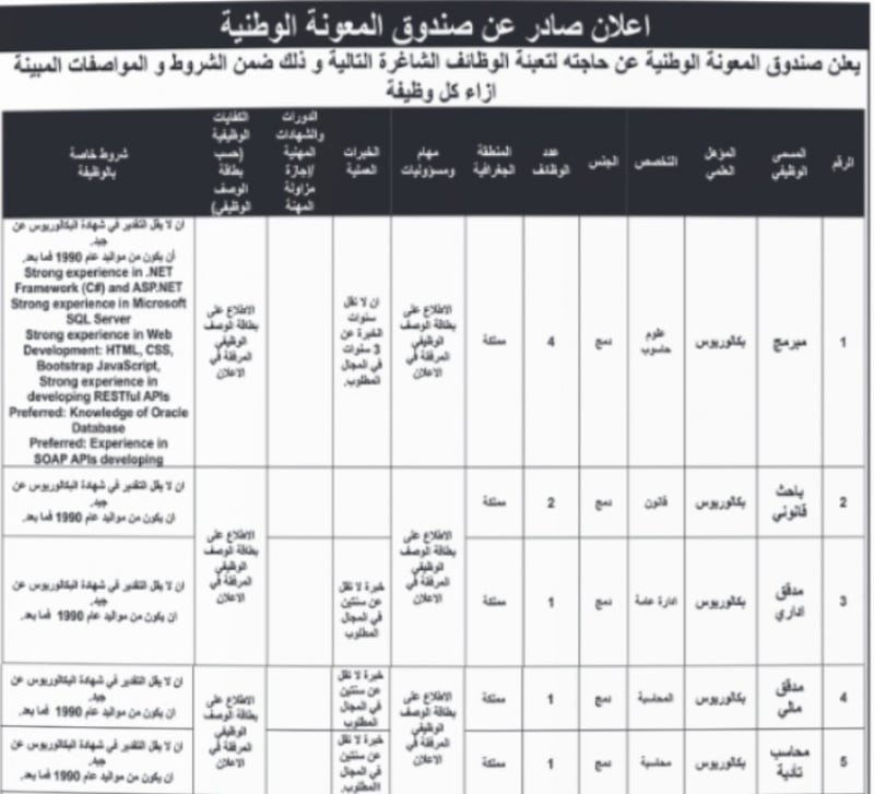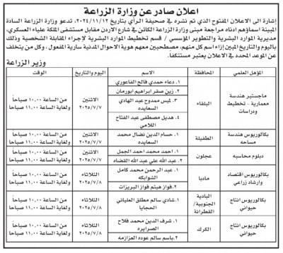 أعلنت عدد من المؤسسات الرسمية، اليوم الأربعاء، عن حاجتها لتعبئة وظائف شاغرة، فيما دعت أخرى عددًا من المرشحين لإجراء المقابلات الشخصية.