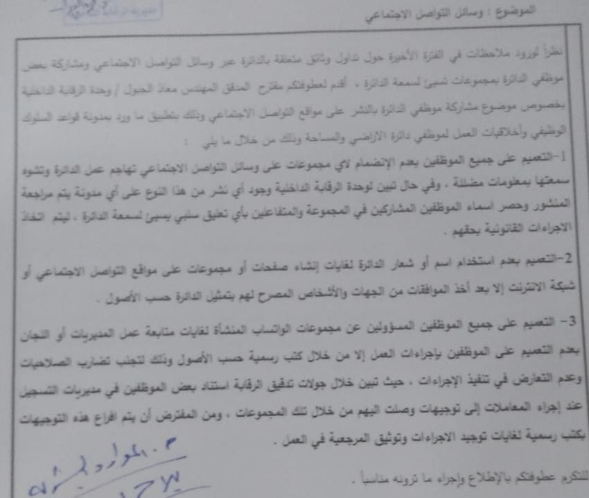 وجاء التعميم بناءً على مذكرة داخلية من وحدة الرقابة في الدائرة، رُفعت قبل أيام، ورصدت وجود مجموعات واتساب وصفحات على "فيسبوك" و"منصات أخرى"، تنشر ما وُصف بـ"معلومات مضللة" أو "مسيئة" تمس بسمعة المؤسسة.