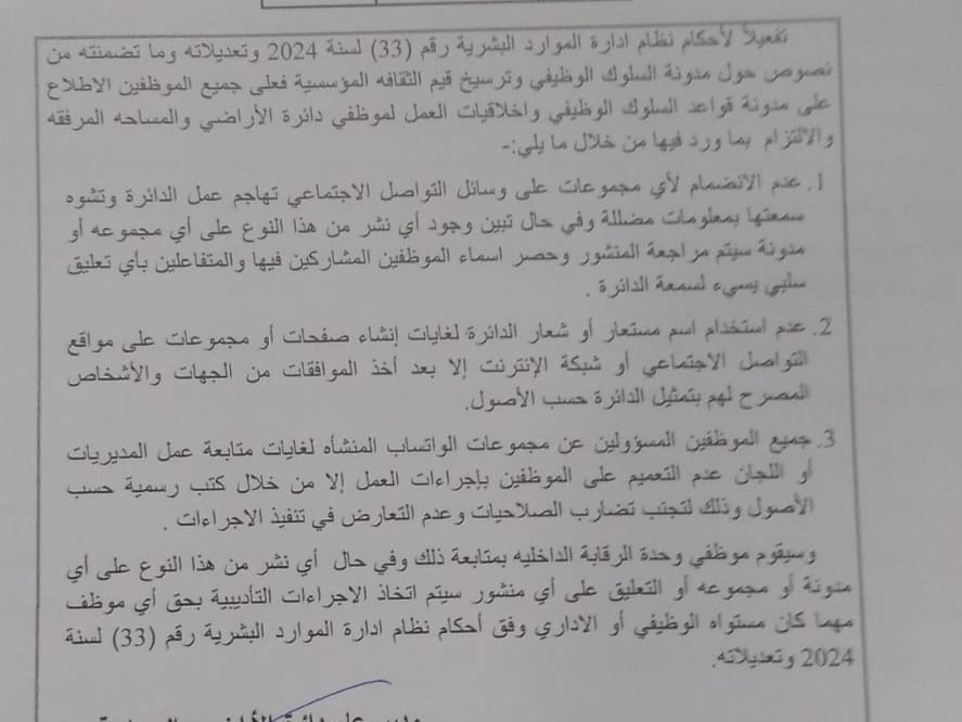 التعميم الصادر بتاريخ 29/6/2025، والموقع من قبل المدير العام للدائرة الدكتور أحمد عيسى العموش، ينص على منع الموظفين من إنشاء أو المشاركة في مجموعات إلكترونية تتناول قضايا الدائرة دون موافقة رسمية، إضافةً إلى حظر نشر أسماء موظفين أو معلومات تتعلق بسير العمل دون تصريح مسبق، وفرض رقابة داخلية على أي محتوى مخالف.