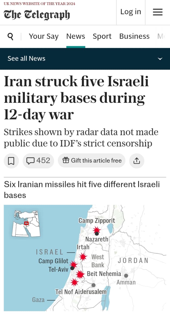 أصابت صواريخ إيرانية 5 قواعد عسكرية إسرائيلية بشكل مباشر خلال الحرب الأخيرة بين طهران وتل ابيب وإسرائيل تكتمت على ذلك، وفق ما كشفته صحيفة التلغراف البريطانية اليوم السبت.