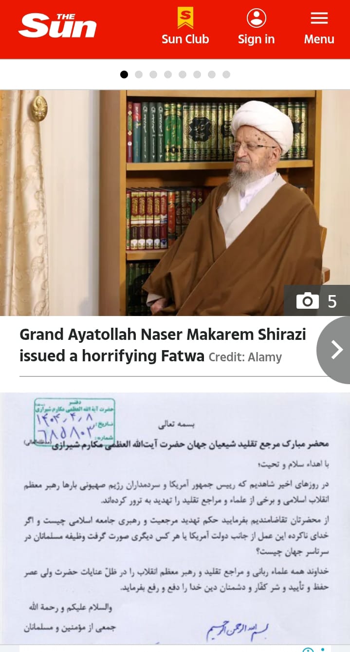 فيما وصفها سياسيون أوروبيون رفيعو المستوى بأنها فتوى من "العصور الوسطى"، طالبت مراجع دينية إيرانية عليا بصلب الرئيس الأميركي دونالد ترمب، ورئيس وزراء العدو الإسرائيلي بنيامين نتنياهو، عقابا لهما على مشاركتها في العدوان على إيران.