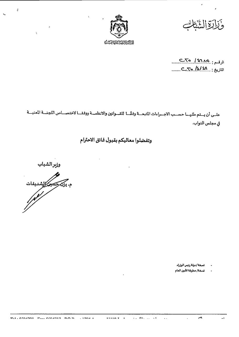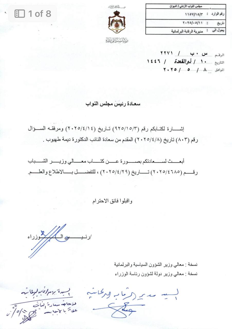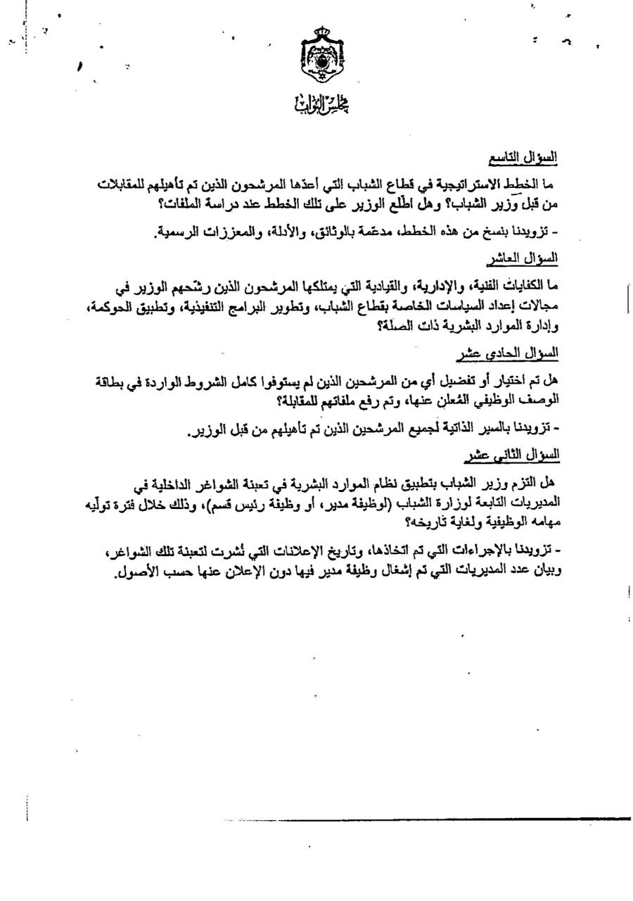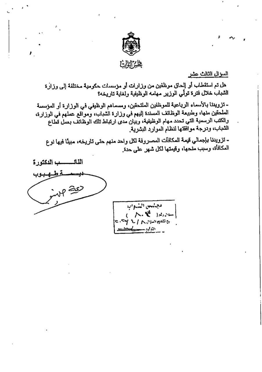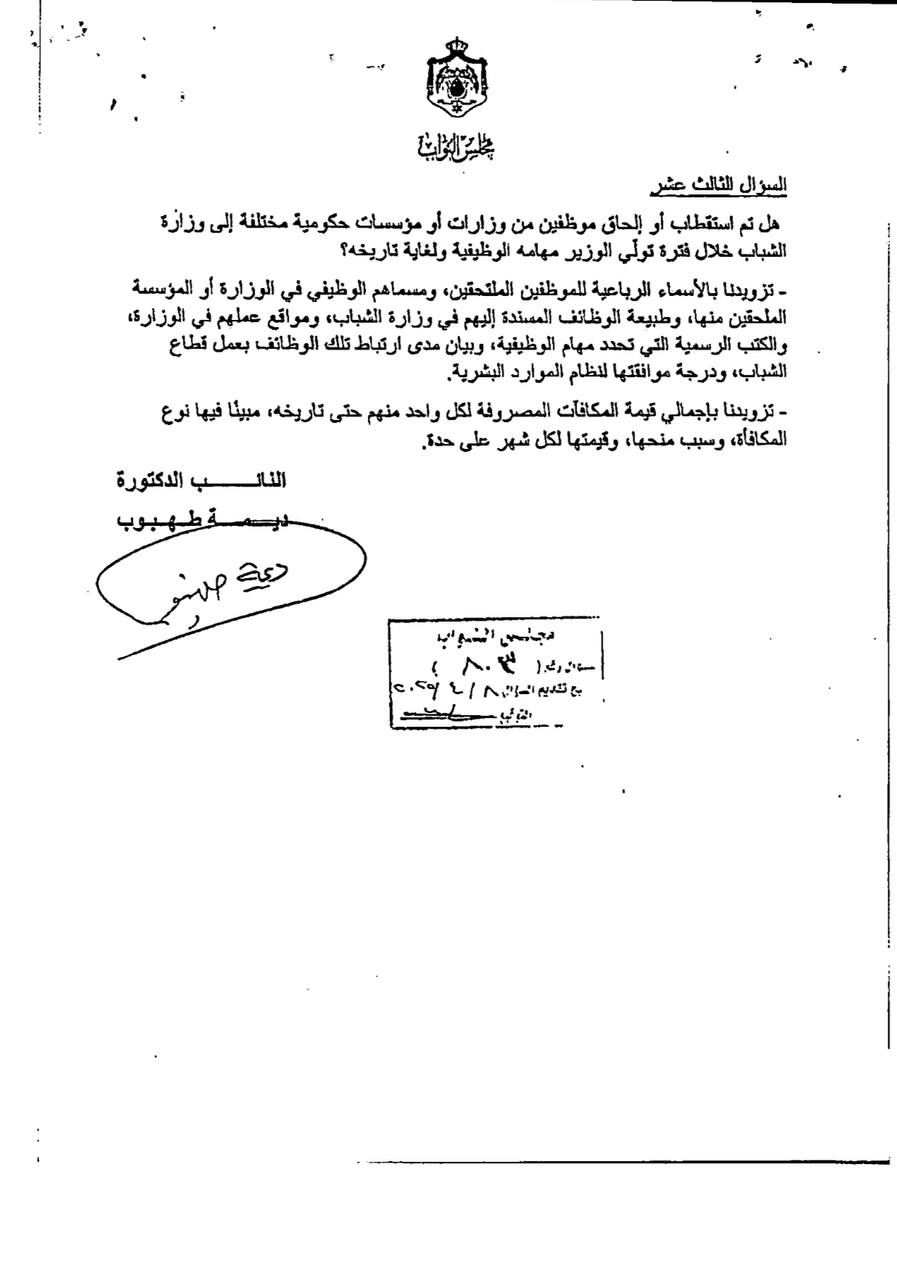 وتالياً كتاب الأسئلة الـ13 التي وجهته سعادة النائب ديمة طهبوب لمعالي وزير الشباب يزن الشديفات والذي وللأسف تخفى واختفى 5 نصوص قانونية وتشريعية فاراً من الإجابة التي كانت بالعموميات وبلا أي تفصيلات أو معلومات ما يؤشر بأن الوزير لم يستطع الصمود في مواجهة مع النائب طهبوب التي دكت وزارة الشباب وهزت أركانها وجعلت وزيرها في مواجهة مع الرأي العام بإجابة سطحية غامضة لا تحمل أي دلالات متناسبة مع طبيعة الأسئلة التي اتسمت بالعمق والجرأة والوضوح بعكس إجابات الوزير الشديفات.