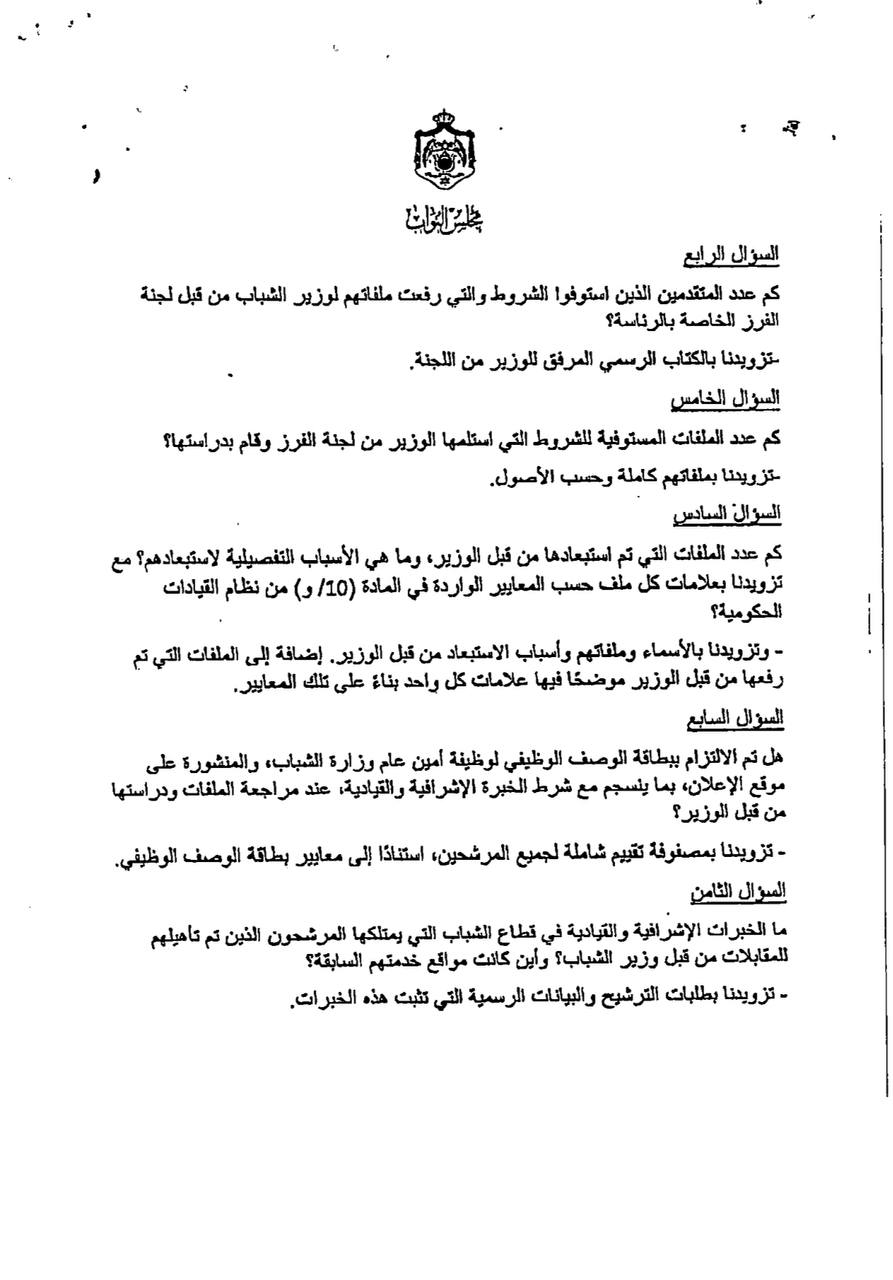 ولفتت إلى أن هذه القضية لا تتعلق فقط بوزارة الشباب وإنما تأخذ أبعاد إعلامية وتوجد بأكثر من مكان، كما وتمت تعيينات في وظائف قيادية بإحدى الوزارات الأخرى وقامت بتوجيه أسئلة للوزير المعني آنذاك، مؤكدة يجب أن تكون القضية في منتهى الشفافية حتى تتم استعادة ثقة المواطن فيما يتعلق بالسياسة الحكومية بالتعيينات القيادية.