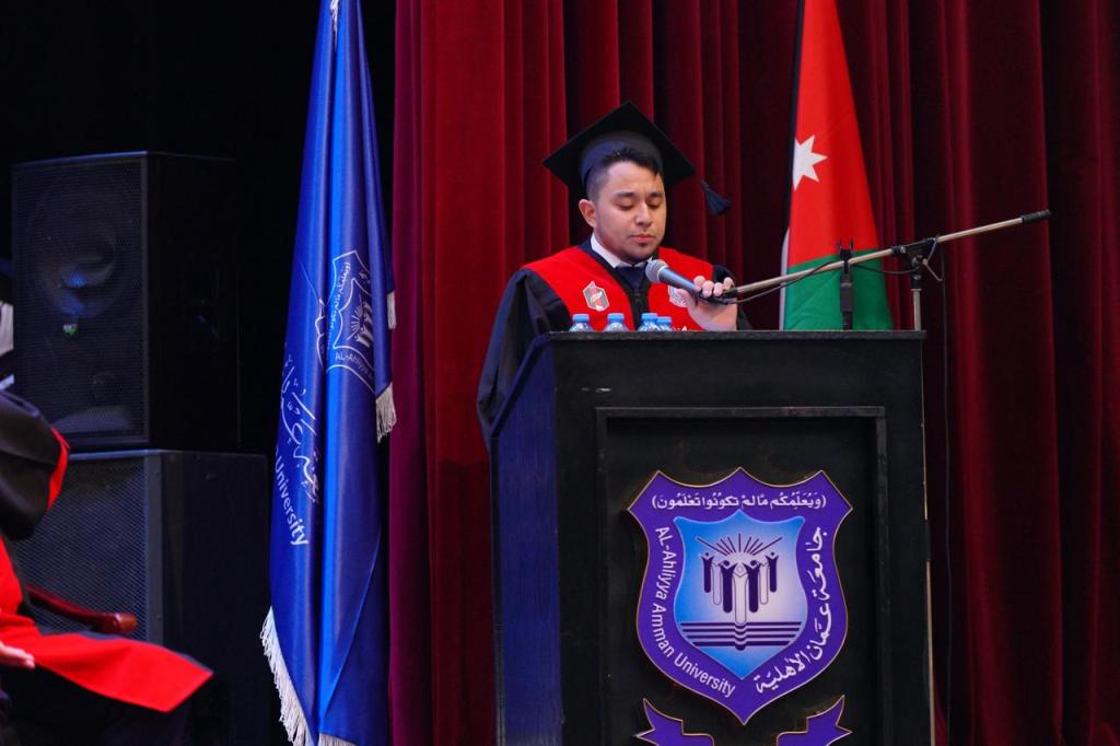 وأردف قائلا: يسرّني ويشرفني أن أرحب بكم أطيب ترحيب في هذا اليوم الذي نحتفي فيه بتخريج كوكبة متميزة من طلبة كلية الدراسات العليا، وكلية الآداب والعلوم، وكلية الأعمال، وكلية الحقوق، وكلية العلوم التربوية، وكلية إدارة الضيافة والسياحة في جامعة عمّان الأهلية.