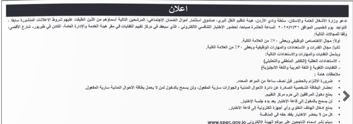 تدعو وزارة الاشغال العامة وسلطة وادي الأردن وهيئة تنظم النقل البري وصندوق استثمار اموال الضمان اليوم الأحد المرشحين التالية اسماؤهم التواجد يوم الخميس 31/7/2025 الساعة العاشرة صباحا لحضور الاختبار التنافسي الالكتروني.