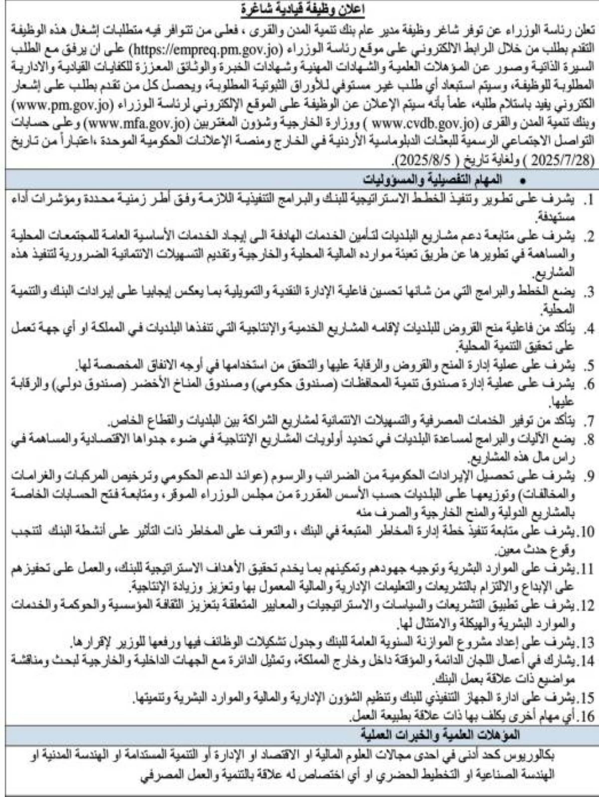 تعلن رئاسة الوزراء عن توفر شاغر وظيفة مدير بنك تنمية المدن والقرى، فعلى من تتوافر فيه متطلبات إشغال هذه الوظيفة التقدم بطلب من خلال الرابط الالكتروني على موقع رئاسة الوزراء (https://empreq.pm.gov.jo) على ان يرفق مع الطلب السيرة الذاتية وصور عن المؤهلات العلمية والشهادات المهنية وشهادات الخبرة والوثائق المعززة للكفايات القيادية والادارية المطلوبة للوظيفة، وسيتم استبعاد أي طلب غير مستوفي للأوراق الثبوتية المطلوبة، ويحصل كل من تقدم بطلب على إشعار الكتروني يفيد باستلام طلبه، علماً بأنه سيتم الإعلان عن الوظيفة على الموقع الإلكتروني لرئاسة الوزراء (www.pm.gov.jo) وبنك تنمية القرى (www.cvdb.gov.jo) ووزارة الخارجية لشؤون المغتربين وعلى حسابات التواصل الاجتماعي الرسمية للبعثات الدبلوماسية الاردنية في الخارج ومنصة الاعلانات الحكومية الموحدة,اعتباراً من تاريخ (2025/7/28 ) ولغاية تاريخ ( 2025/8/5 ).