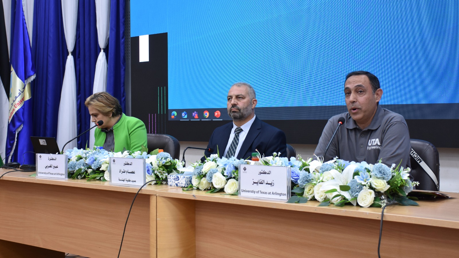 ومن جانب جامعة تكساس أرلينغتون، شارك في الندوة كل من الدكتورة عبير المغربي والدكتور زيد الفايز، حيث قدّما عرضًا تفصيليًا حول البرامج الأكاديمية والمنح الدراسية المتاحة للطلبة، وآليات التقديم ومتطلبات القبول، بالإضافة إلى شرحٍ وافٍ حول أوجه التعاون المشترك بين الجامعتين في مجالات الهندسة والبحث العلمي.