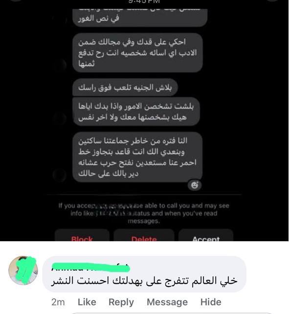 التهديدات التي أرسلت إلى الغزاوي في المرة الأولى عبر تطبيق الماسنجر، حملت لهجة تصعيدية وصلت إلى حد "إعلان الحرب" على الغزاوي وتهديد أشبه بـ"القتل"، فقط لأنه تجرأ على ممارسة حقه في النقد المهني.