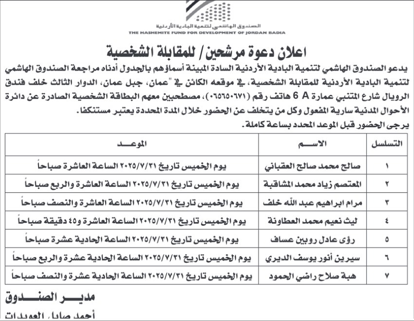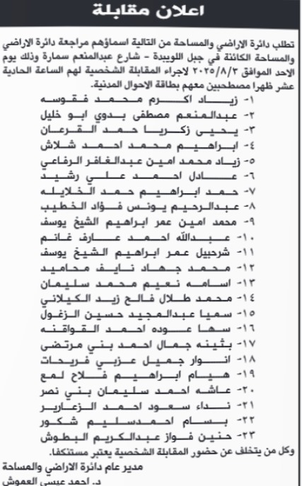 دعت مؤسسات حكومية اليوم الأربعاء التالية أسماؤهم لإجراء المقابلة الشخصية.