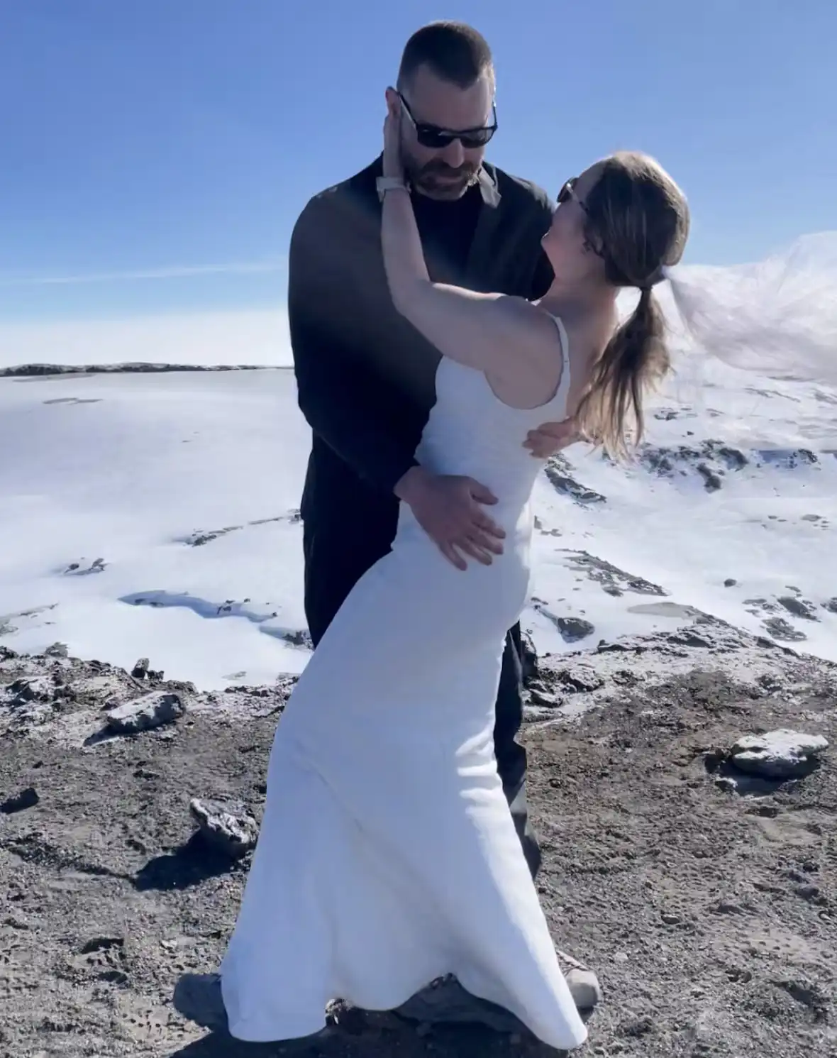 اختارت بون فستانًا خفيفًا من موقع إلكتروني، يتناسب مع طبيعة الرحلة، ورافق الزوجان أصدقاءهما في تسلق دام سبعة أيام، انتهى بزفاف غير تقليدي على قمة الجبل على ارتفاع 19,341 قدمًا.