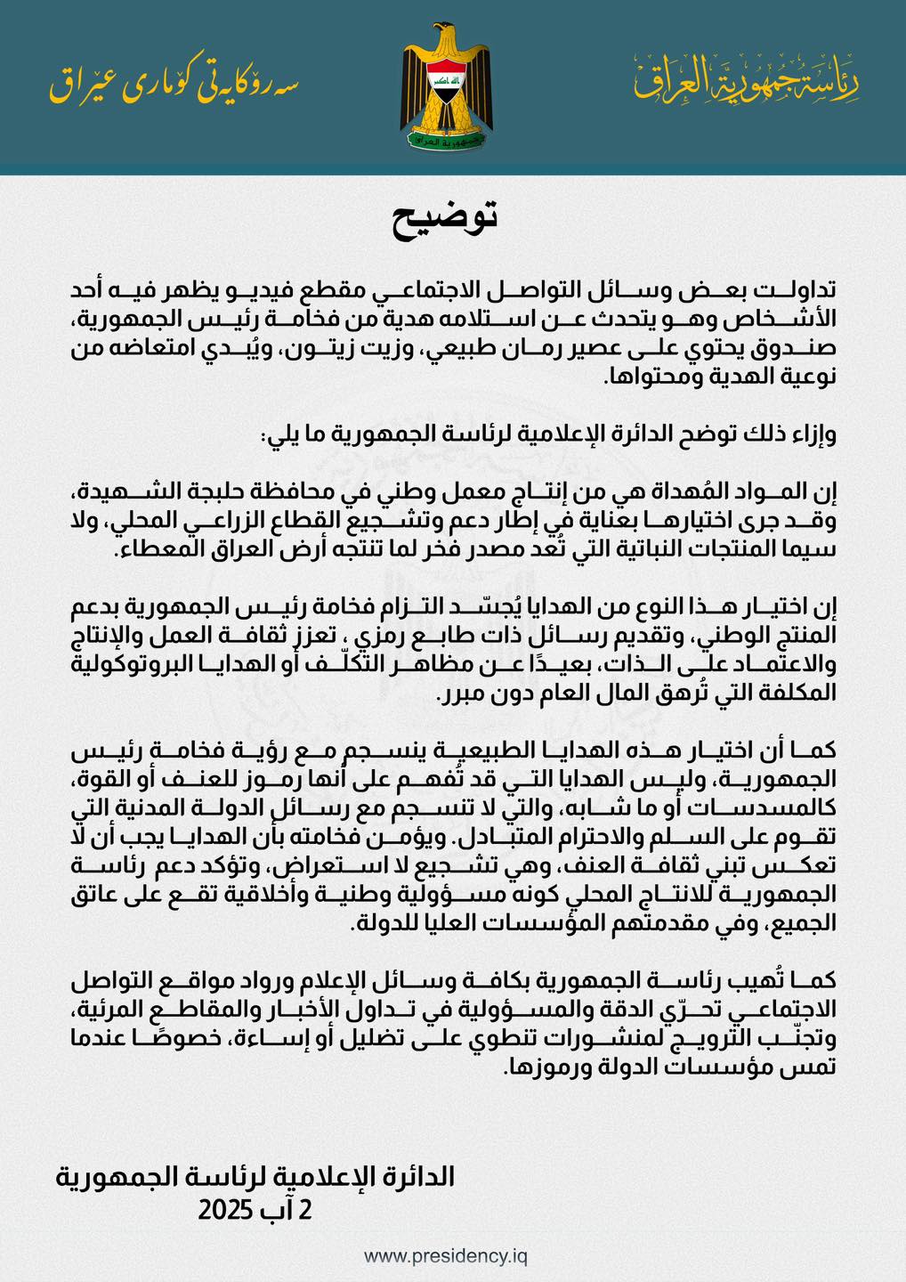 وذكر البيان أن "المواد المهداة هي من إنتاج مصنع محلي في محافظة حلبجة الشهيدة، وتم اختيارها بعناية في إطار دعم وتشجيع القطاع الزراعي المحلي، خاصة المنتجات النباتية التي تشكل مصدر فخر لما تنتجه أرض العراق الخصبة".