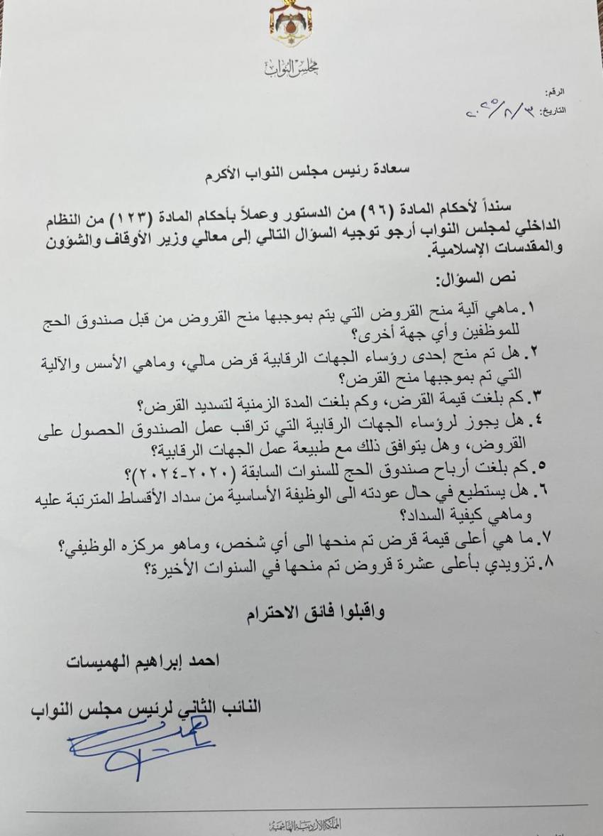 النائب الهميسات بطرحه هذا السؤال يقوم بدوره ممثلاً عن الشعب حاملاً أمانة المساءلة البرلمانية في قضية تمس أموال الأردنيين وثقتهم بالمؤسسات الدينية والمالية، مؤكداً أنه ينتظر رداً من الوزارة ويأمل أن يكون شفافاً وواضحاً وإيجابياً، بما يطمئن الرأي العام على مصير أموالهم ويقطع الطريق أمام أي تجاوز محتمل.