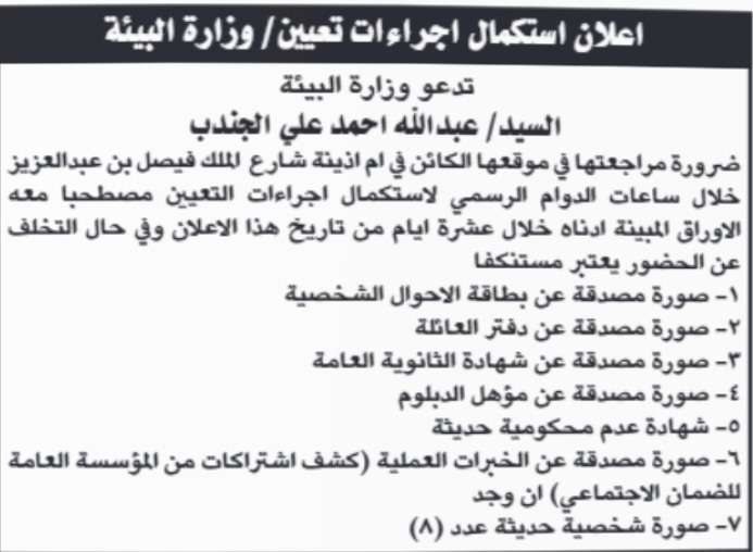 دعت وزارة البيئة، اليوم الاثنين، التالية أسماؤهم لاستكمال إجراءات التعيين.