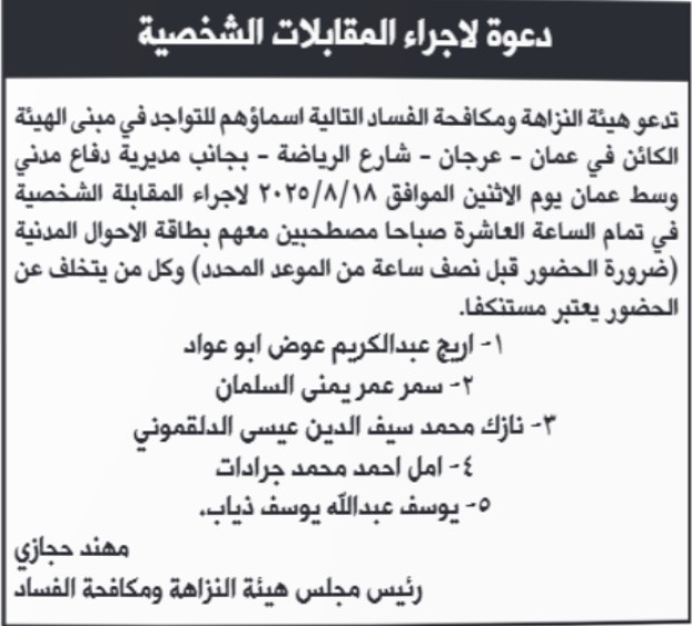 كما دعت هيئة النزاهة ومكافحة الفساد، التالية أسماؤهم لإجراء المقابلة الشخصية.