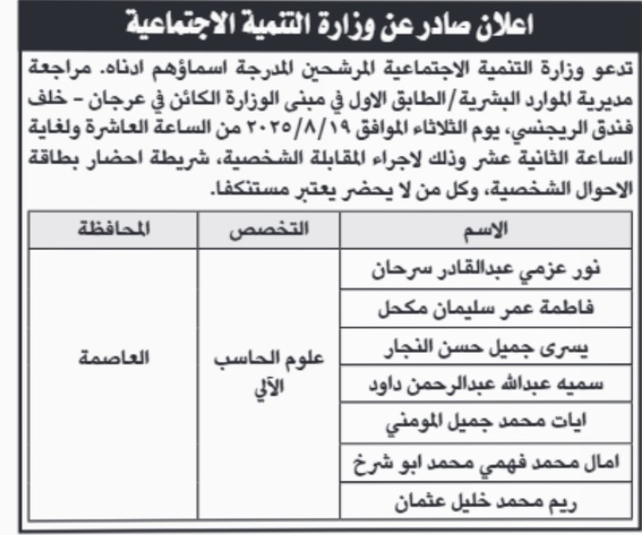 كما دعت وزارة التنمية الاجتماعية التالية أسماؤهم لإجراء المقابلة الشخصية.