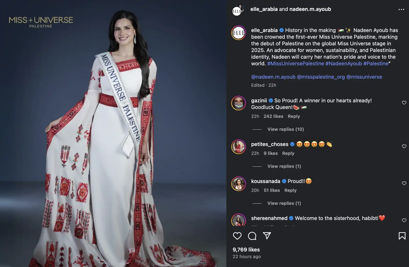 أعلنت الشابة نادين أيوب، المقيمة بين دبي ورام الله، مشاركتها في مسابقة ملكة جمال الكون 2025 لتمثيل فلسطين، في سابقة تاريخية تُسجَّل للبلاد في هذه المنافسة العالمية.