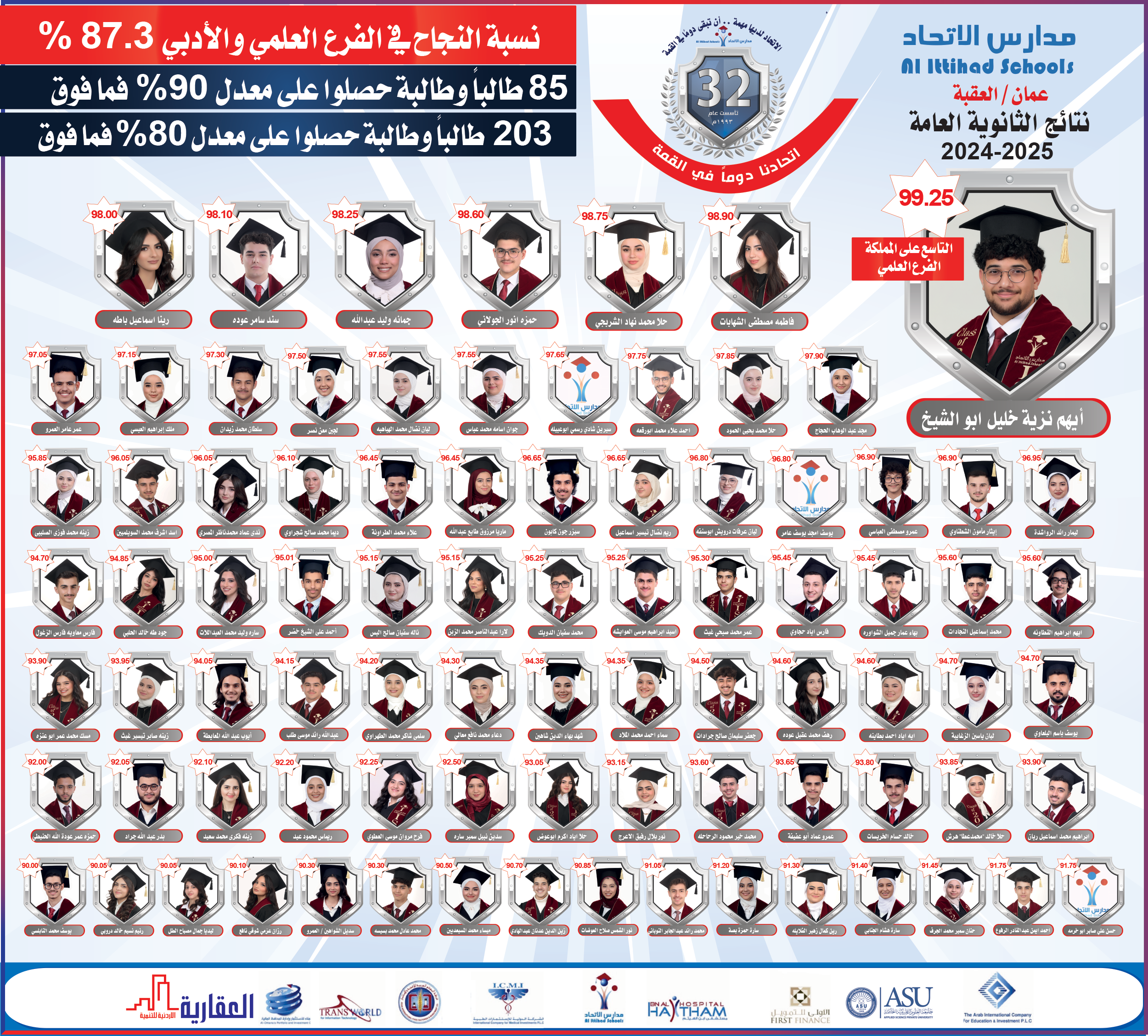 ميعاد خاطر - اليوم تتنفس مدارس الاتحاد نفسا عميقا وعظيما بعد أن تخطت عاما أخر بتخريج الفوج الــ 32 بمزيد من الإنجاز والتميز وثبات السطوع، فقد حققت مدارس الاتحاد تميزا لافتا في نتائج الثانوية العامة سواء كانت في العقبة جنوبا أم عمّان العاصمة "بنين وبنات" ،حيث احتلت مدارس الاتحاد وسطرت مجدها بالمركز التاسع على المملكة حيث توج الطالب ايهم نزيه خليل ابو الشيخ بمعدل 99.25 ، وسجلت نسبة النجاح في مدارس الاتحاد 87.3%، وقد حصل 85 طالب وطالبة على معدل فوق 90، و حصل 203 طالب فوق الثمانين، كما حققت مدارس الاتحاد اداءً مميزاً في البرنامج البريطاني والامريكي حيث حصد طالبان على العلامة الكاملة في البرنامج البريطاني..