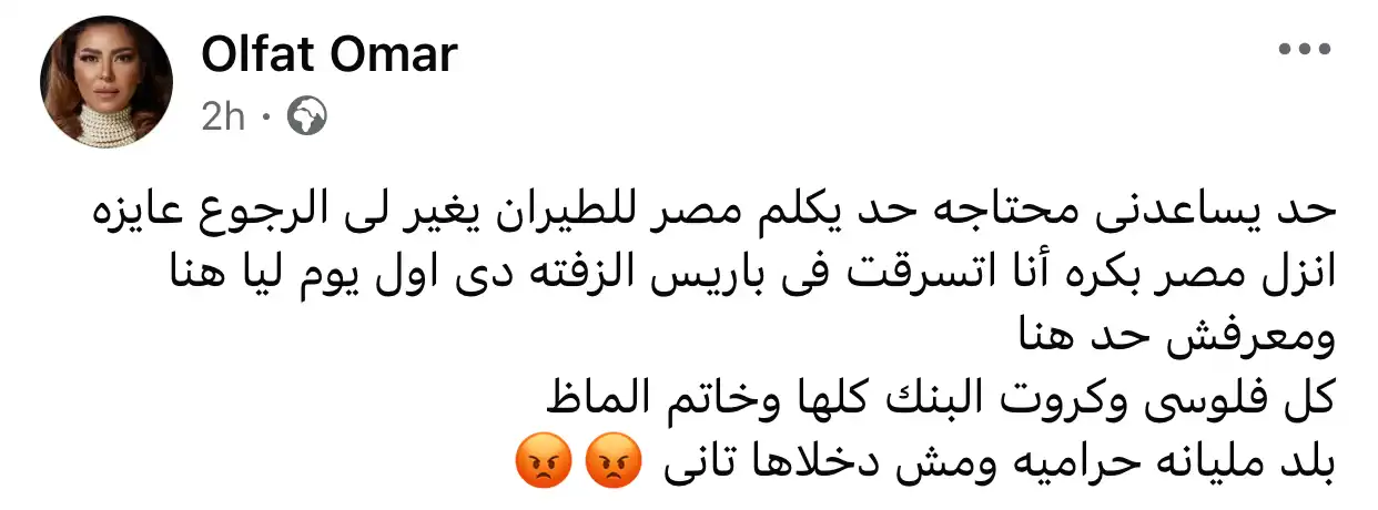 وقالت ألفت في منشورها على فيسبوك "حد يساعدني محتاجة حد يكلم مصر للطيران يغير لي الرجوع عايزة أنزل مصر بكرة أنا اتسرقت في باريس الزفتة دي أول يوم لي هنا ومعرفش حد هنا، كل فلوسي وكروت البنك كلها وخاتم ألماس، بلد مليانة حرامية ومش هدخلها تاني"، بحسب وسائل إعلام مصرية.