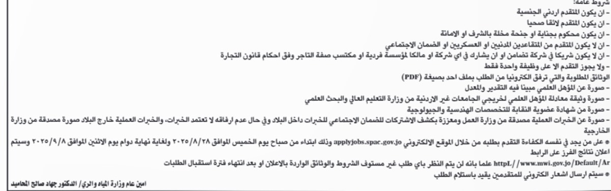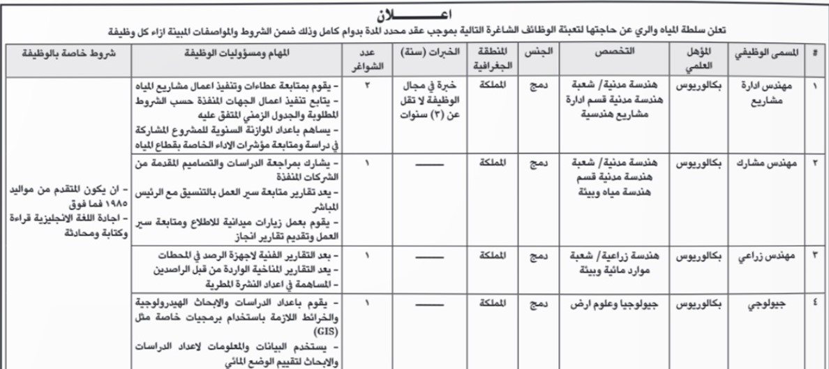 اعلنت سلطة المياه والري اليوم الاربعاء عن حاجتها لتعبئة وظائف شاغرة بموجب عقد محدد.