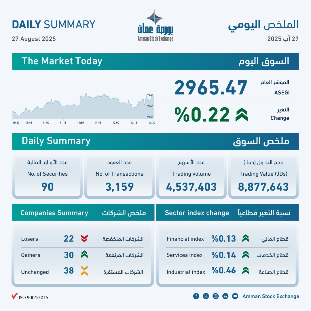 بلغ حجم التداول الإجمالي في بورصة عمان اليوم الأربعاء، حوالي 8.9 مليون دينار وعدد الأسهم المتداولة 4.5 مليون سهم، نفذت من خلال 3159 عقداً.