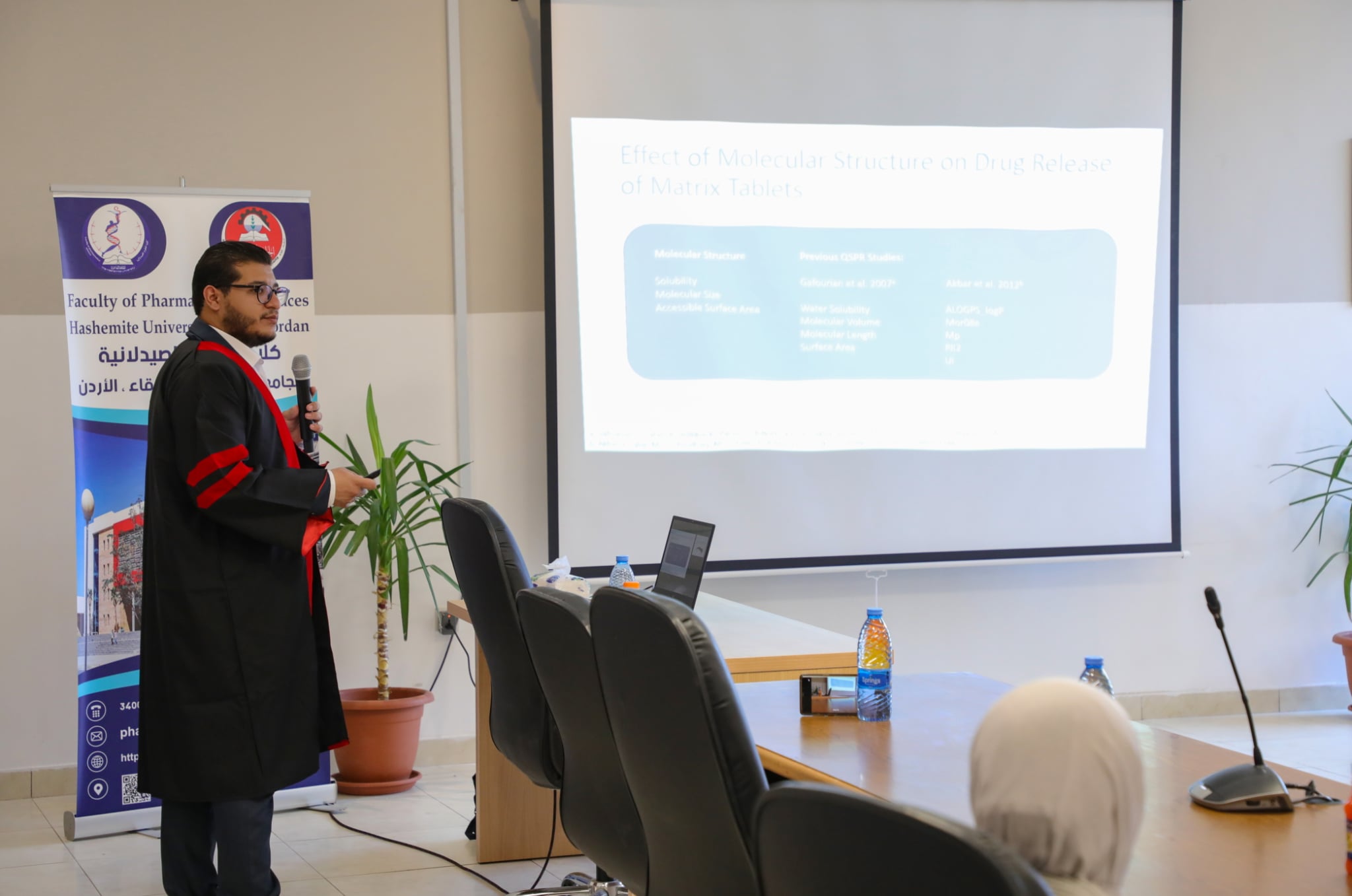وأشرف على الرسالة التي قدّمها الطالب محمد هشام سريه بعنوان: "Investigating Drug Release from Corchorus Olitorius Hydrocolloid Matrices through QSPR Modeling" ، الأستاذ الدكتور نزار الزعبي، والدكتورة رند شاهين كمشرف مشارك، وناقشها كل من الأستاذ الدكتور حاتم الخطيب من الجامعة الأردنية، والدكتور نبيل الهاشمي والدكتورة عرين الشويات من الجامعة الهاشمية.