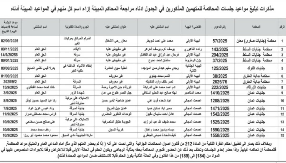 صدرت اليوم الاثنين، مذكرات تبليغ مواعيد جلسات المحاكمة لمشتكى عليهم ولمتهمين وقرارات امهال لحضور جلسات محاكمة.وطلبت المذكرات من المذكورين في الجداول أدناه مراجعة المحاكم المبينة ازاء اسم كل منهم في المواعيد المبينة أدناه.وتاليا الأسماء والمواعيد: