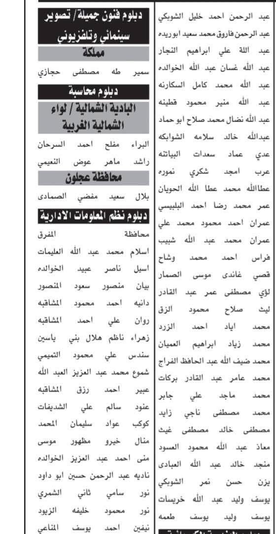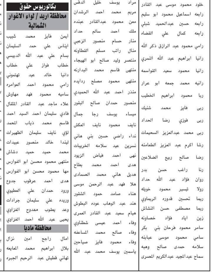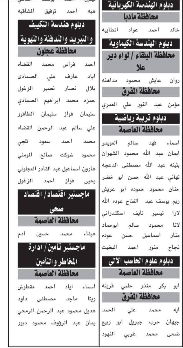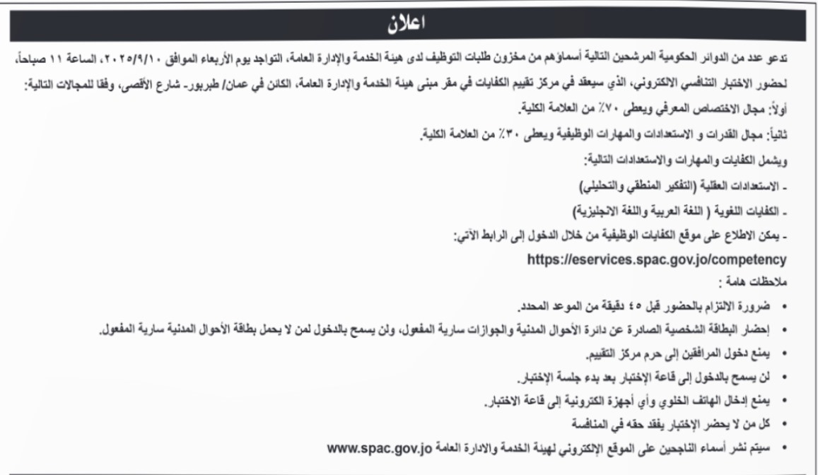 دعت عدد من الدوائر الحكومية، اليوم الأربعاء، المرشحين التالية أسماؤهم إلى التواجد يوم الأربعاء 10/9/2025، الساعة 11 صباحًا، لحضور الاختبار التنافسي الإلكتروني، وفقًا للمجالات التالية: