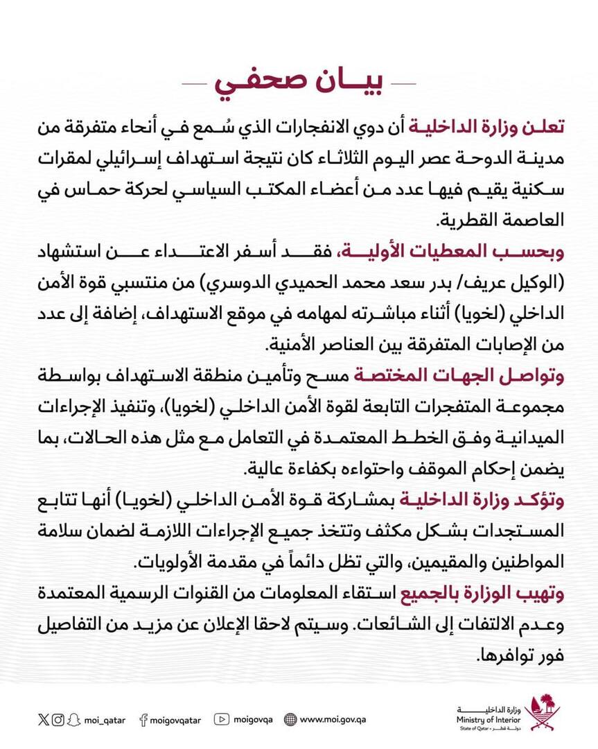 وقالت الوزارة في بيان، "تعلن وزارة الداخلية أن دويّ الانفجارات الذي سمع في أنحاء متفرقة من مدينة الدوحة عصر يوم الثلاثاء كان نتيجة استهداف إسرائيلي لمقرات سكنية يقيم فيها عدد من أعضاء المكتب السياسي لحركة حماس في العاصمة القطرية".