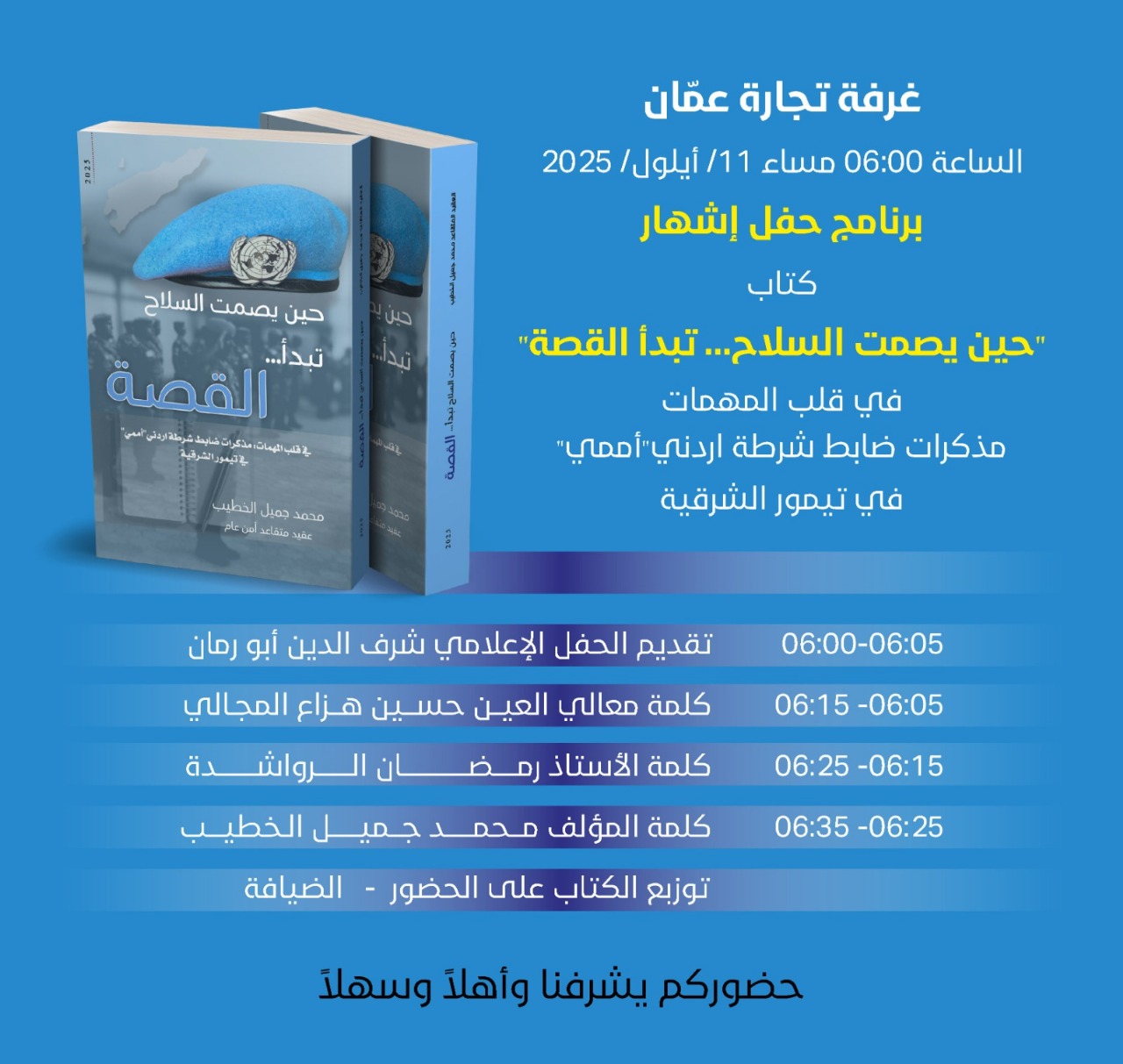 تستعد غرفة تجارة عمان لاستضافة حفل إشهار كتاب "حين يصمت السلاح… تبدأ القصة” للعقيد المتقاعد محمد جميل الخطيب، وذلك عند الساعة السادسة من مساء يوم الخميس 11 أيلول 2025، على المسرح الرئيسي في مبنى الغرفة.