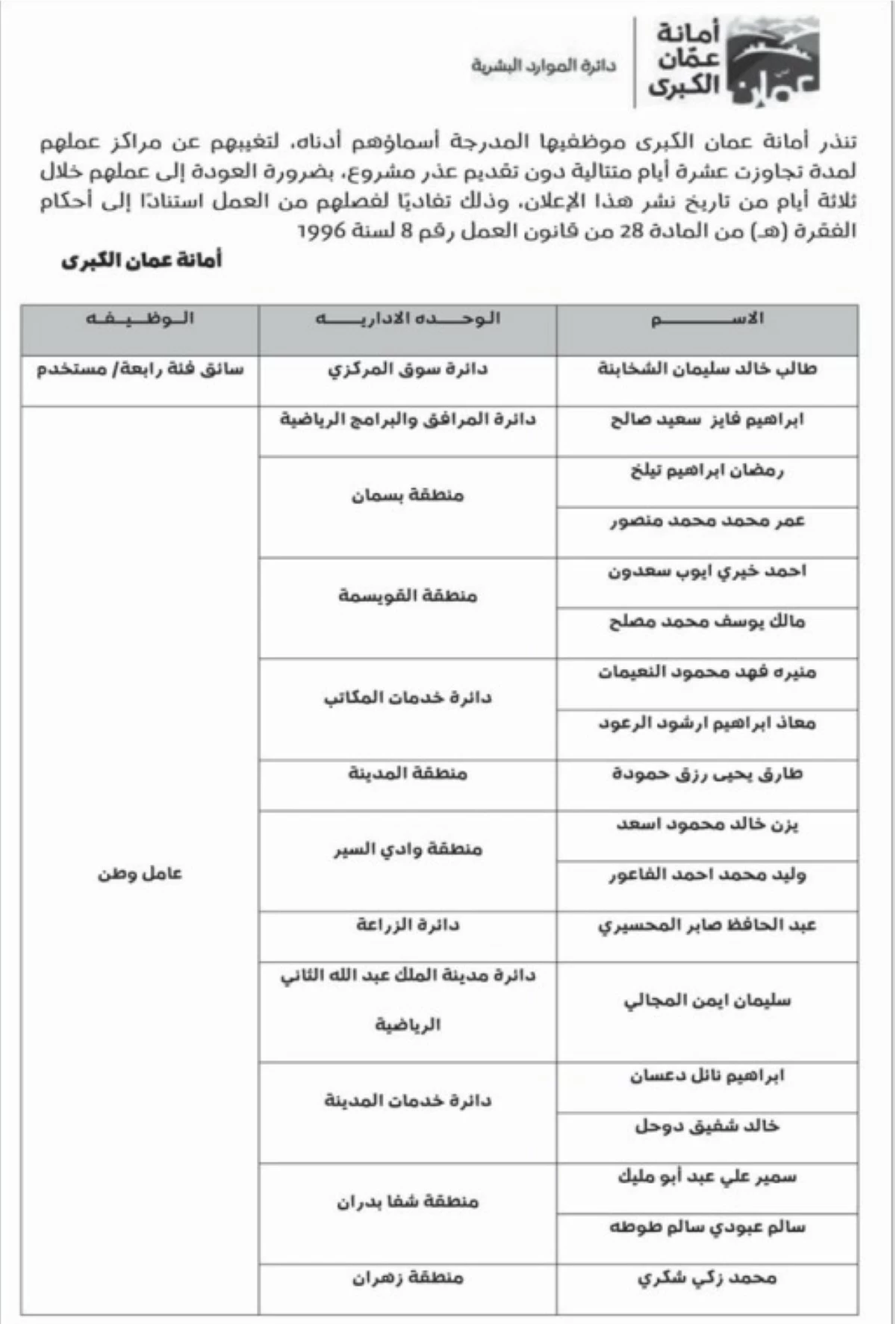 أنذرت أمانة عمّان الكبرى، اليوم الأحد، 181 موظفاً بالفصل من العمل، بسبب تغيبهم عن مراكز عملهم لأكثر من 10 أيام متتالية دون تقديم عذر مشروع.