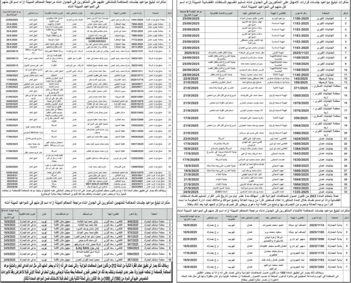 وطلبت المذكرات من المذكورين في الجداول أدناه مراجعة المحاكم المبينة ازاء اسم كل منهم في المواعيد المبينة أدناه.وتاليا الأسماء والمواعيد: