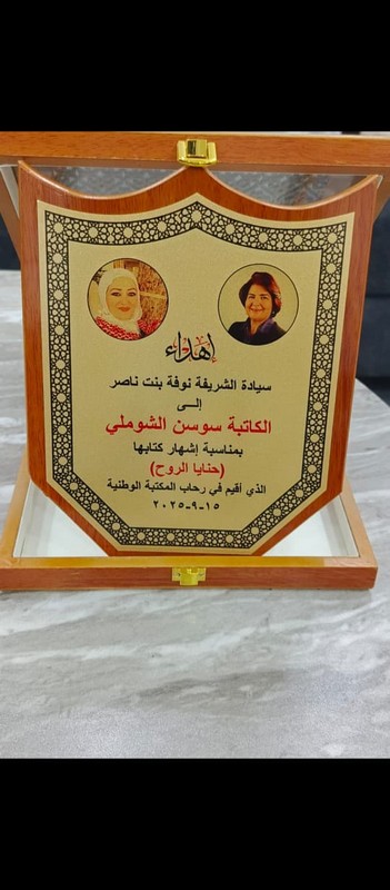تحت رعاية كريمة من سيادة الشريفة نوفة بنت ناصر، في المكتبة الوطنية بعمان، حفل إشهار الكتاب الأول للأديبة سوسن الشوملي، السفير التنفيذي للمنظمة العربية للتنمية المستدامة ورئيسة مركز المرأة التابع لها – فرع الأردن، بعنوان "حنايا الروح".
