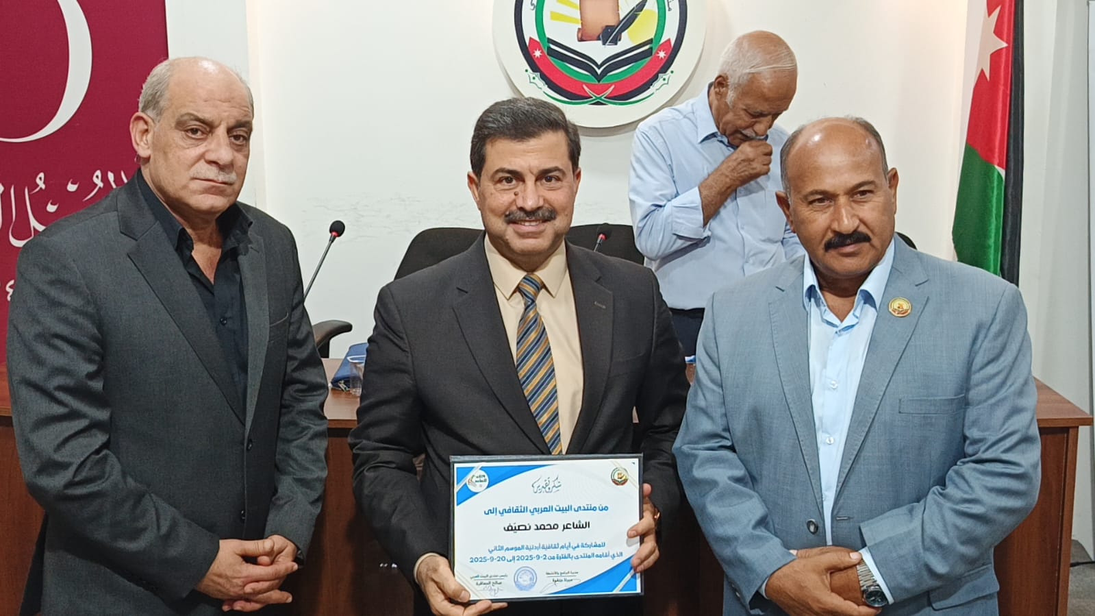 وفي ختام الأمسية، قدّم رئيس المنتدى درع التكريم لدارة المشرق للفكر والثقافة، تسلّمه الشاعر علي الفاعوري، إضافة إلى شهادات شكر وتقدير للشعراء المشاركين. وحظيت الفعالية بحضور واسع من الأدباء والمثقفين والمهتمين بالشأن الثقافي، الذين أشادوا بمبادرات منتدى البيت العربي ودوره في إثراء المشهد الثقافي الأردني من خلال أمسياته وفعالياته النوعية.