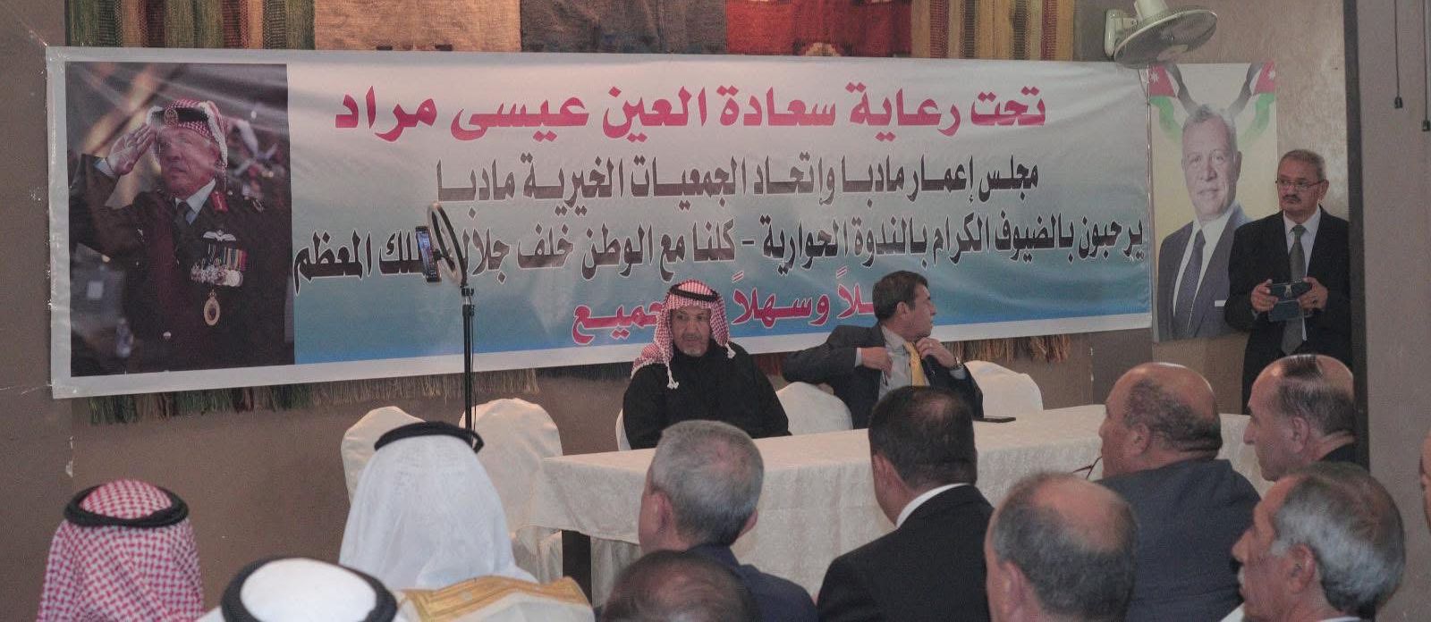 تحت رعاية العين عيسى مراد، نظّم مجلس إعمار مادبا واتحاد الجمعيات الخيرية، لقاءً وطنيًا في محافظة مادبا، تأكيدًا على دعم مواقف جلالة الملك عبدالله الثاني تجاه القضايا الإقليمية والدولية، بمشاركة عدد من الأعيان والنواب من داخل المحافظة وخارجها، وشخصيات وطنية ووجهاء وممثلين عن المجتمع المحلي.