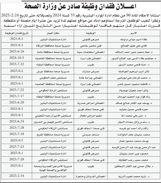 أعلنت وزارة الصحة، الاربعاء، عن فقدان عدد من الموظفين لوظائفهم، وذلك استناداً لأحكام المادة (96) من نظام إدارة الموارد البشرية رقم (33) لسنة 2024 وتعديلاته حتى تاريخ 24 فبراير 2025، وذلك بسبب التغيب غير المبرر عن مواقع العمل لمدة تزيد عن عشرة أيام، سواء كانت متصلة أو متقطعة.