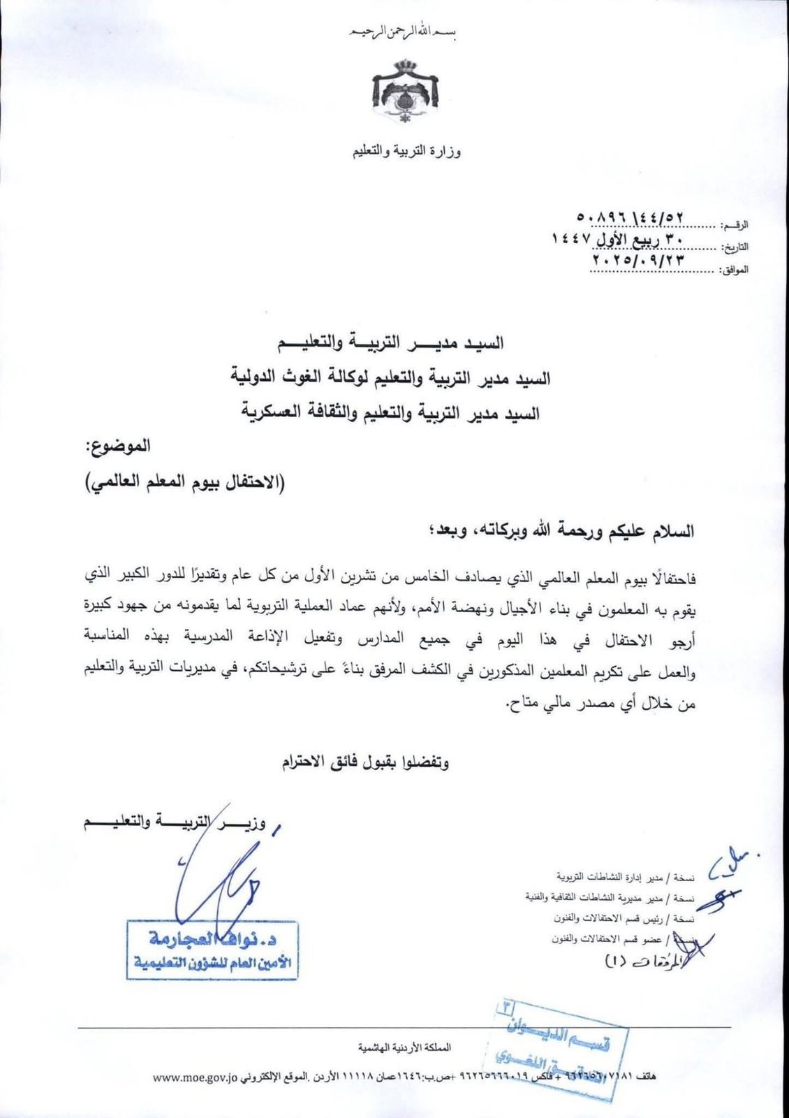 وعممت الوزارة على جميع مدارس المملكة بالاحتفال في هذه المناسبة للدور الذي يقوم به المعلمون في بناء الاجيال ونهضة الامم .