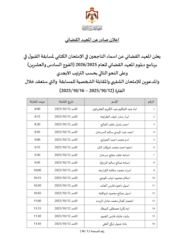 - أعلن المعهد القضائي عن أسماء الناجحين في الامتحان الكتابي لمسابقة القبول في برنامج دبلوم المعهد القضائي للعام 2025/2026 ، (الفوج السادس والعشرين).