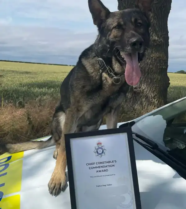 حصلت كلبة بوليسية على جائزة الشجاعة بعد إنقاذها حياة مدربها من رجل عدواني يحمل مجرفة في شقة بمدينة هال البريطانية.