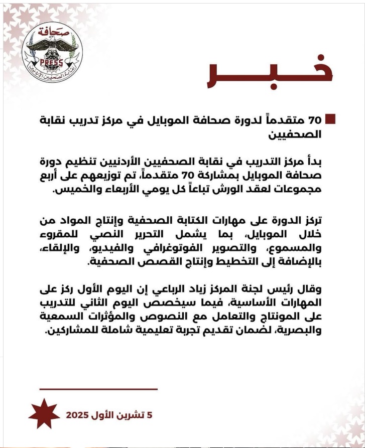 بدأ مركز التدريب في نقابة الصحفيين الأردنيين تنظيم دورة صحافة الموبايل بمشاركة 70 متقدماً، تم توزيعهم على أربع مجموعات لعقد الورش تباعاً كل يومي الأربعاء والخميس.