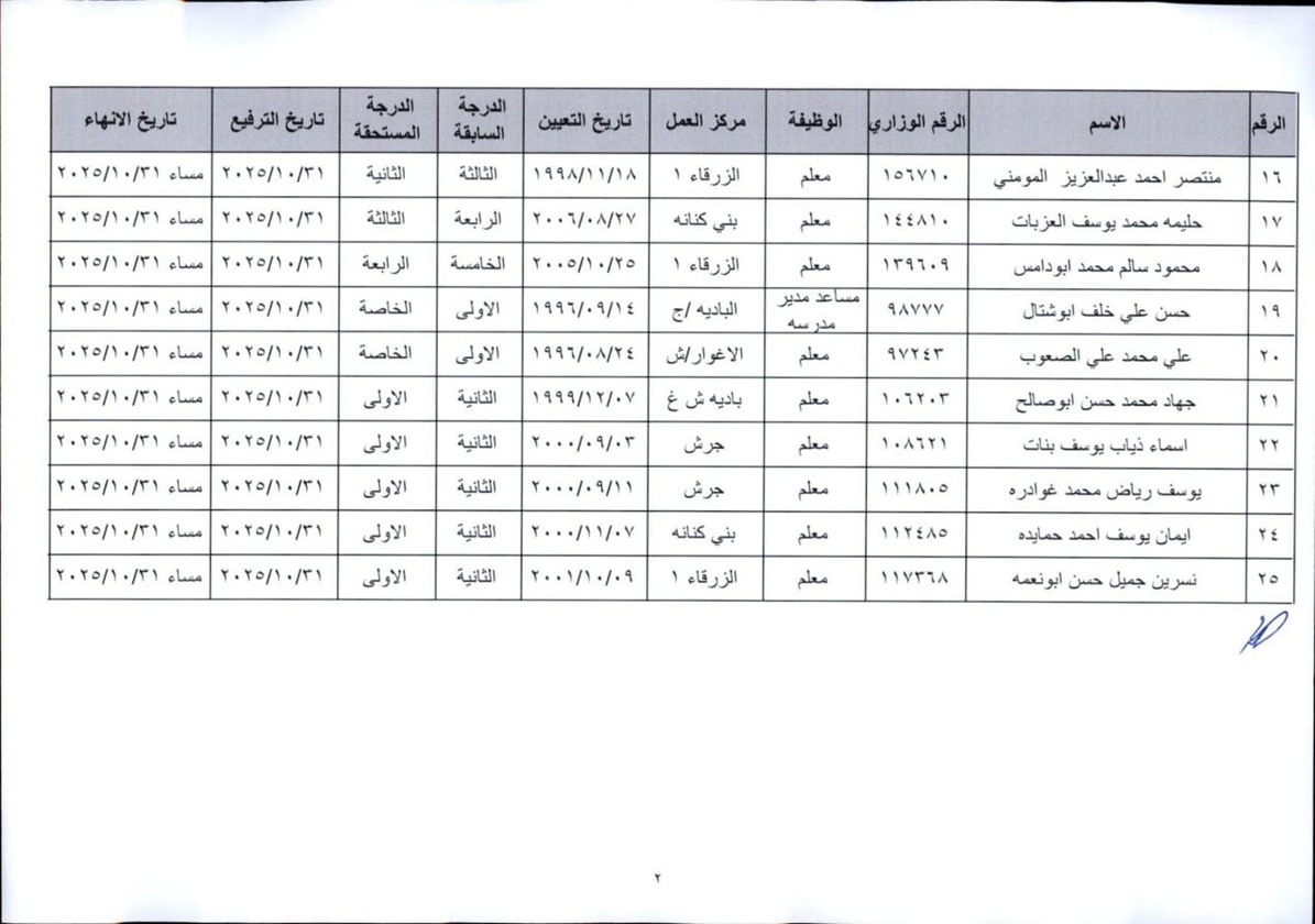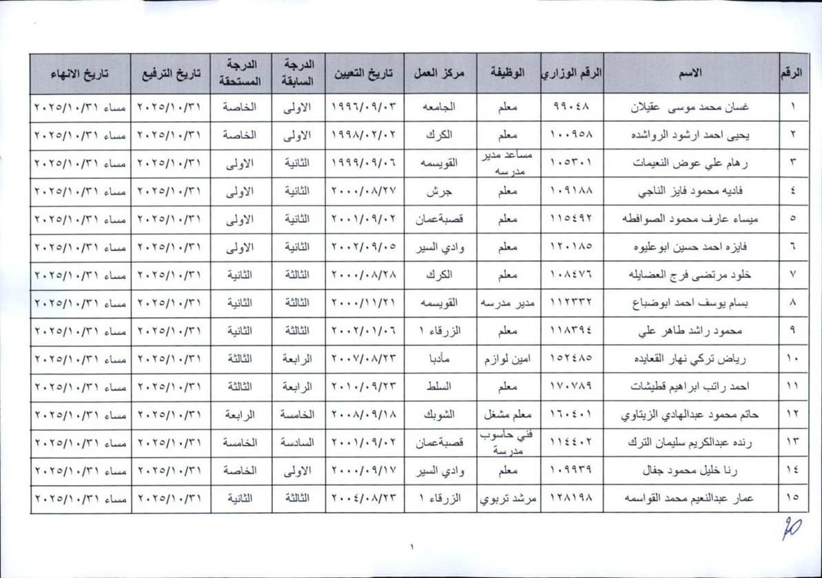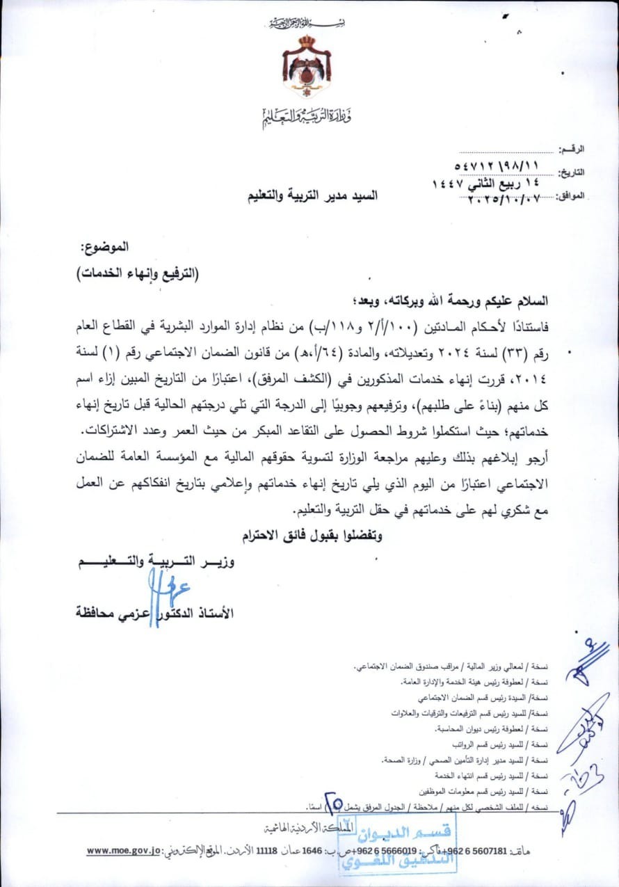 قرر وزير التربية والتعليم الدكتور عزمي محافظة ترفيع وانهاء خدمات المذكورين في الكشف المرفق اعتبارا من التاريخ المبين ازاء اسم كل منهم .