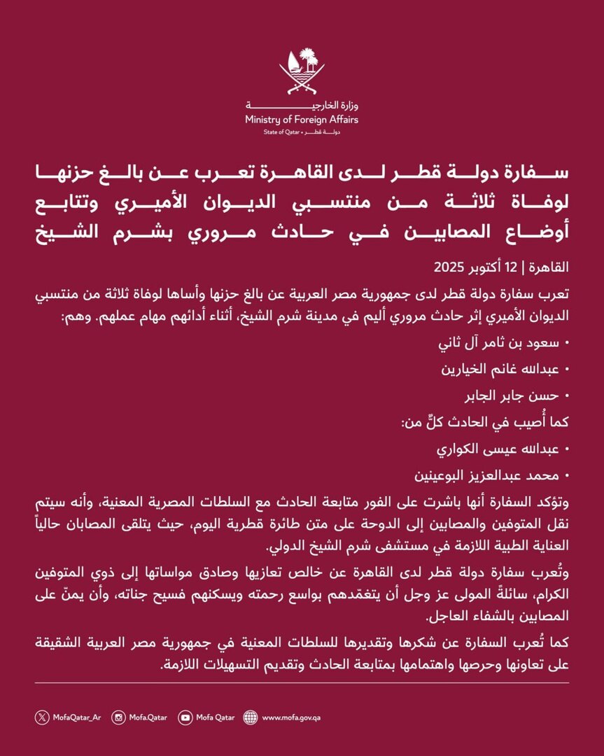 وأصدرت السفارة القطرية بيانا في أعقاب الحادثة التي تسببت بوفاة 3 من أعضاء من الوفد القطري الذي يعمل حاليا في مصر، وإصابة اثنين آخرين لافتة إلى تلقيهم العلاج الطبي اللازم في مستشفى شرم الشيخ الدولي.
