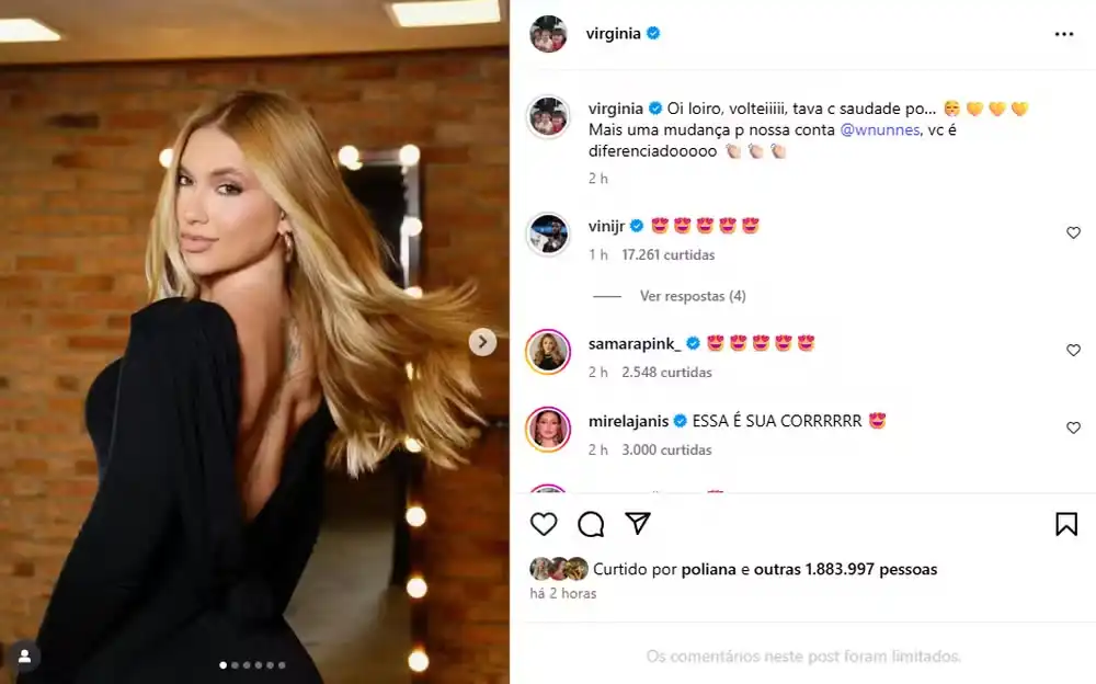 استعرضت المذيعة البرازيلية الحسناء فيرجينيا إطلالتها الجديدة، فقد ظهرت مقدمة برنامج سابادو على وسائل التواصل الاجتماعي بشعرها الأشقر.