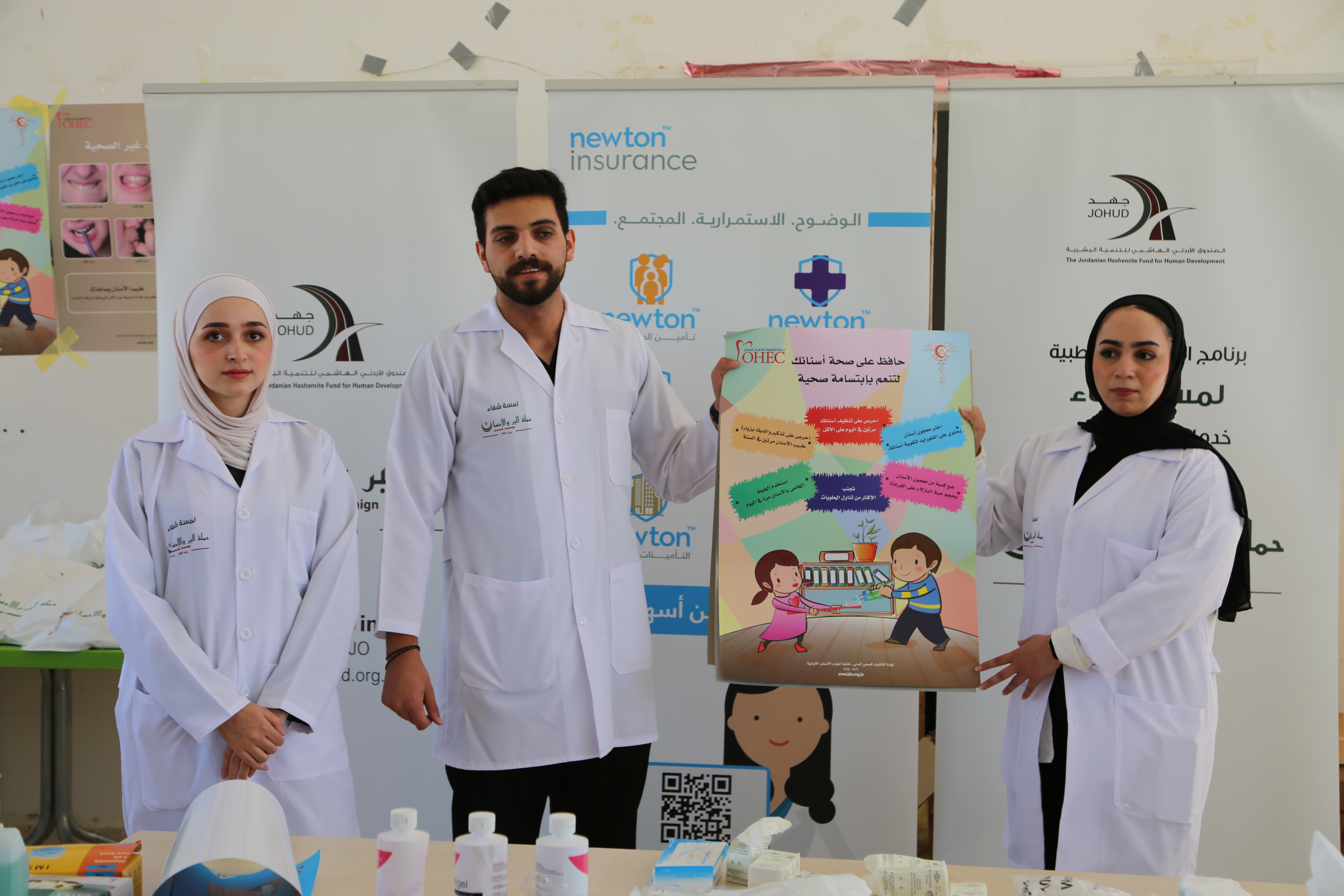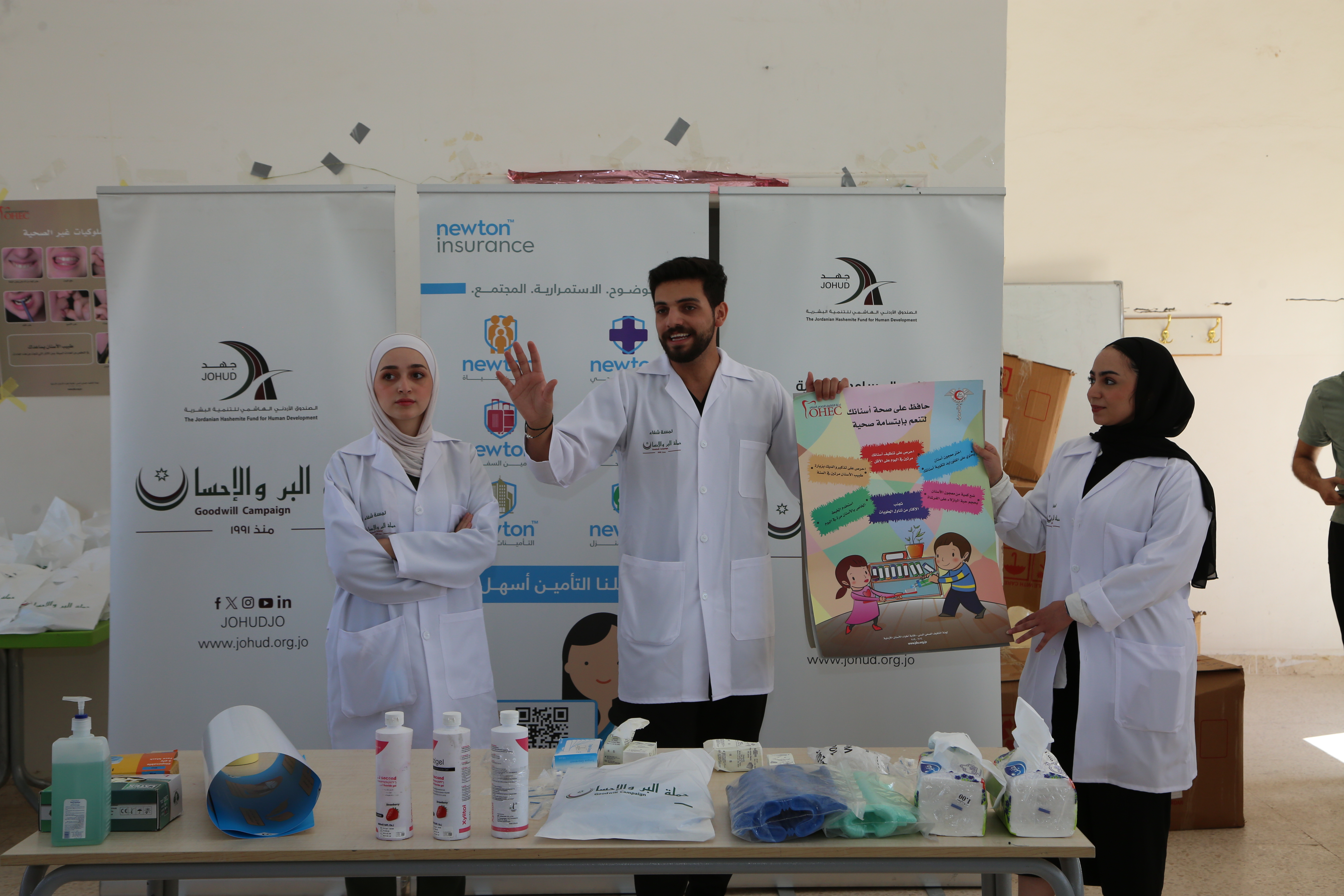 نظمت حملة البر والإحسان في الصندوق الأردني الهاشمي للتنمية البشرية – جهد، بالتعاون مع شركة نيوتن للتأمين، وبحضور مميز للمدير العام الاستاذ اسامة الزعبي والسيد نضال كرابلة ممثلين عن الشركة،وكلية التمريض في الجامعة الأردنية – فرع العقبة، ومديرية الصحة المدرسية (الصحة السنية) التابعة لوزارة الصحة، يومًا طبيًا مجانيًا متخصصًا بأمراض الفم والأسنان، لتقديم الخدمات الطبية التي شملت الفحص، والتوعية والتثقيف الصحي، وتوزيع المنشورات التوعوية ومستلزمات العناية الشخصية، إضافة إلى تقديم العلاجات السنية من خلال العيادة المتنقلة المجهزة.